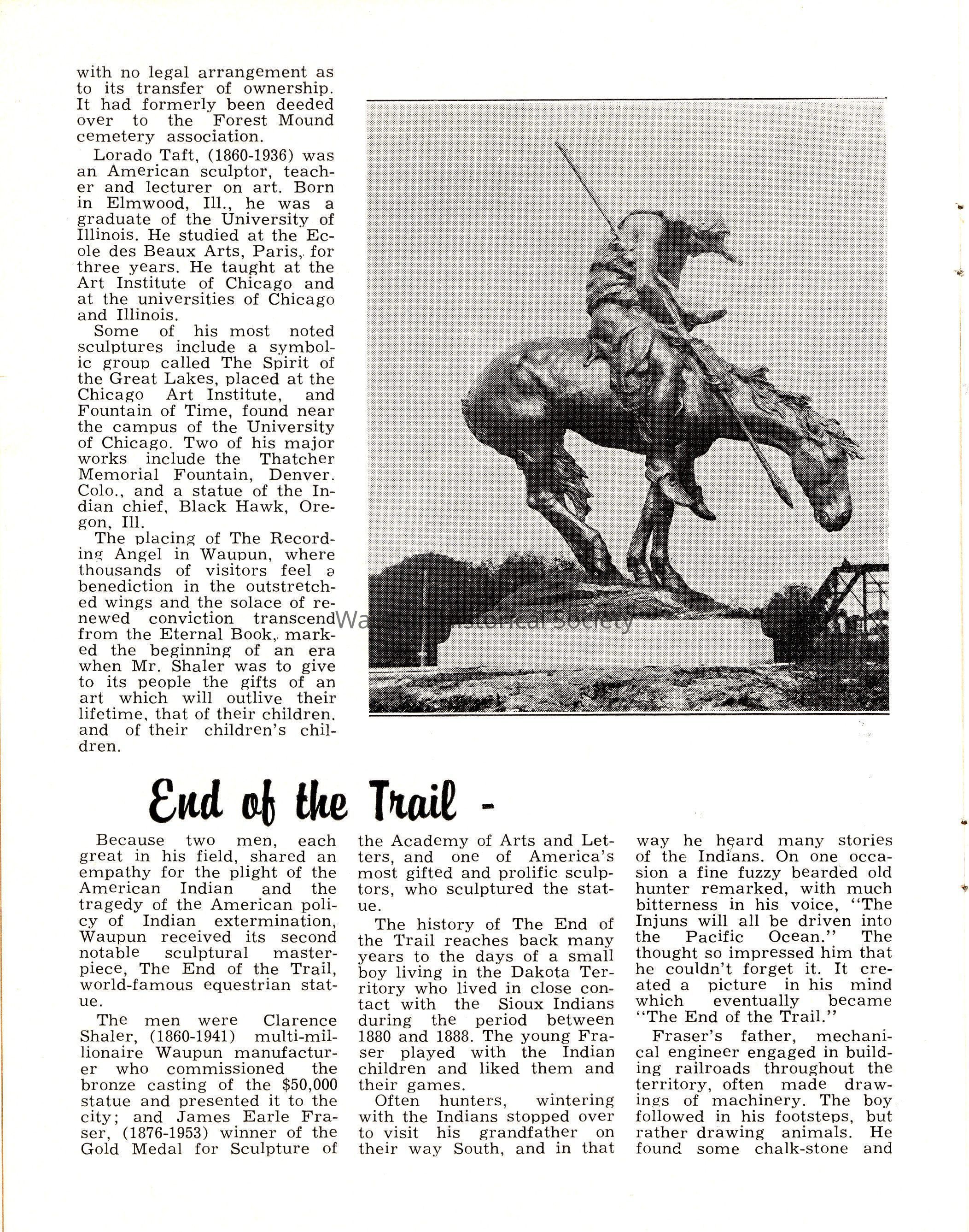 In another letter dated Feb. 24, 1926, Mr. Shaler wrote ... "Just received a letter from Fraser acknowledging order for End of Trail, but he wants two years in which to finish it, and will come to Waupun before starting on large figure so as to see location and know just the right size to make it.