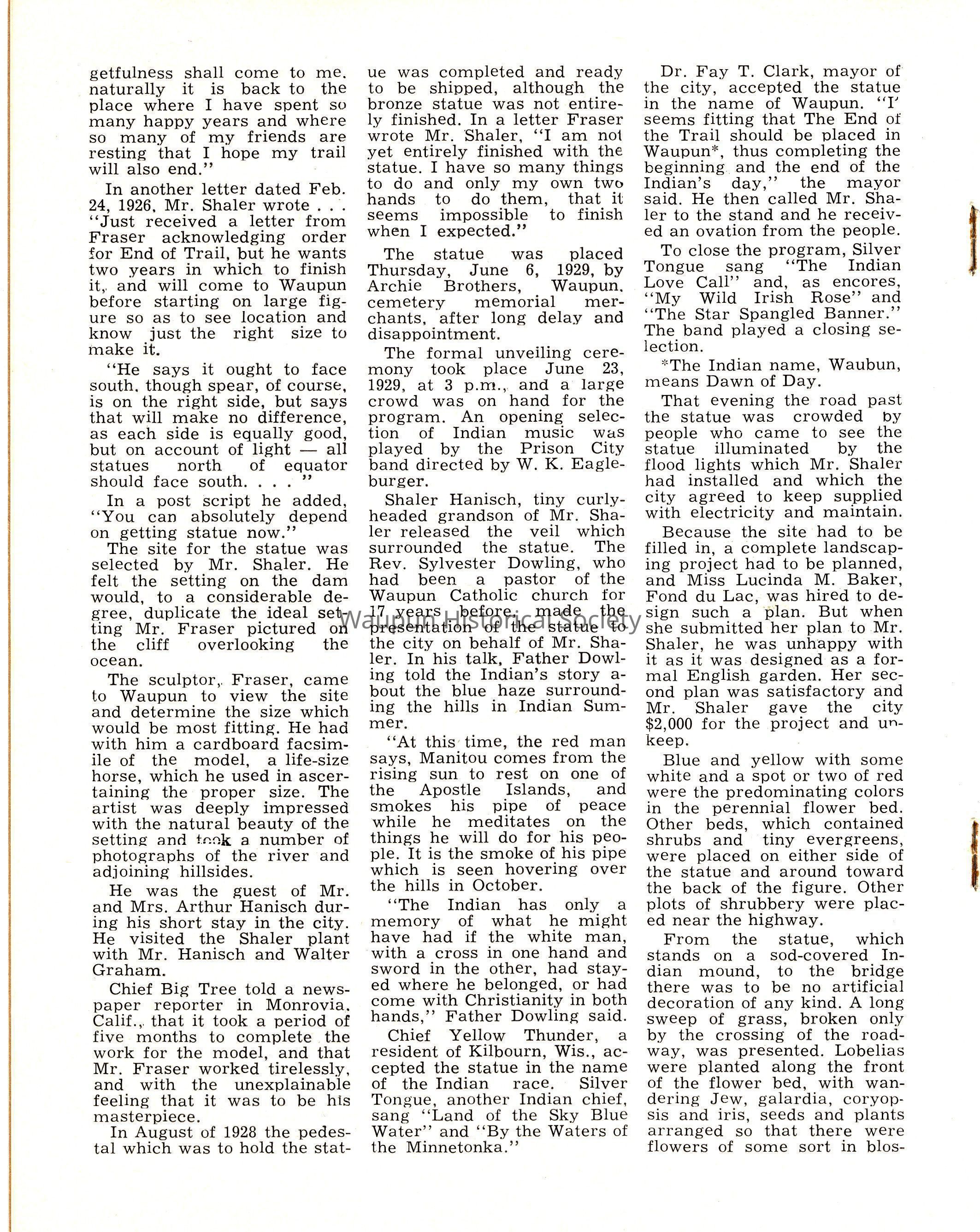 Dr. Fay T. Clark, mayor of the city, accepted the statue in the name of Waupun. "I' seems fitting that The End of the Trail should be placed in Waupun*, thus completing the beginning and the end of the Indian's day," the mayor said. He then called Mr. Shaler to the stand and he received an ovation from the people.