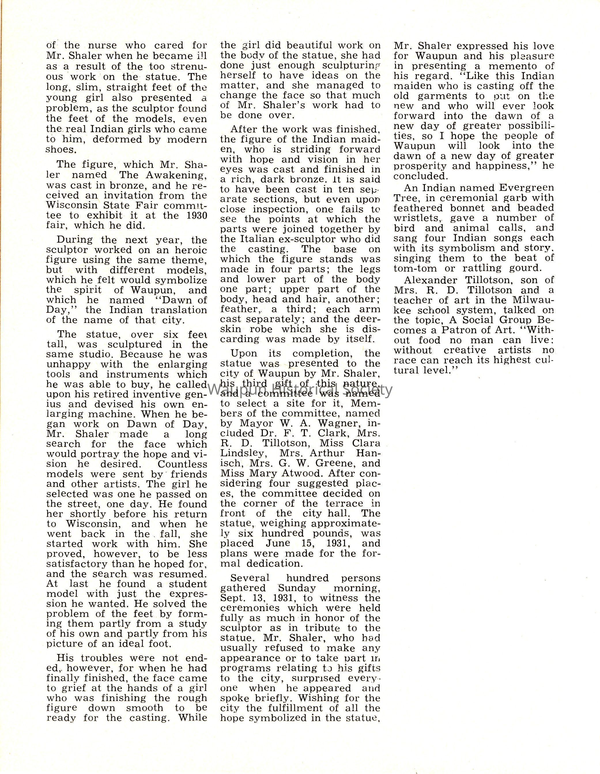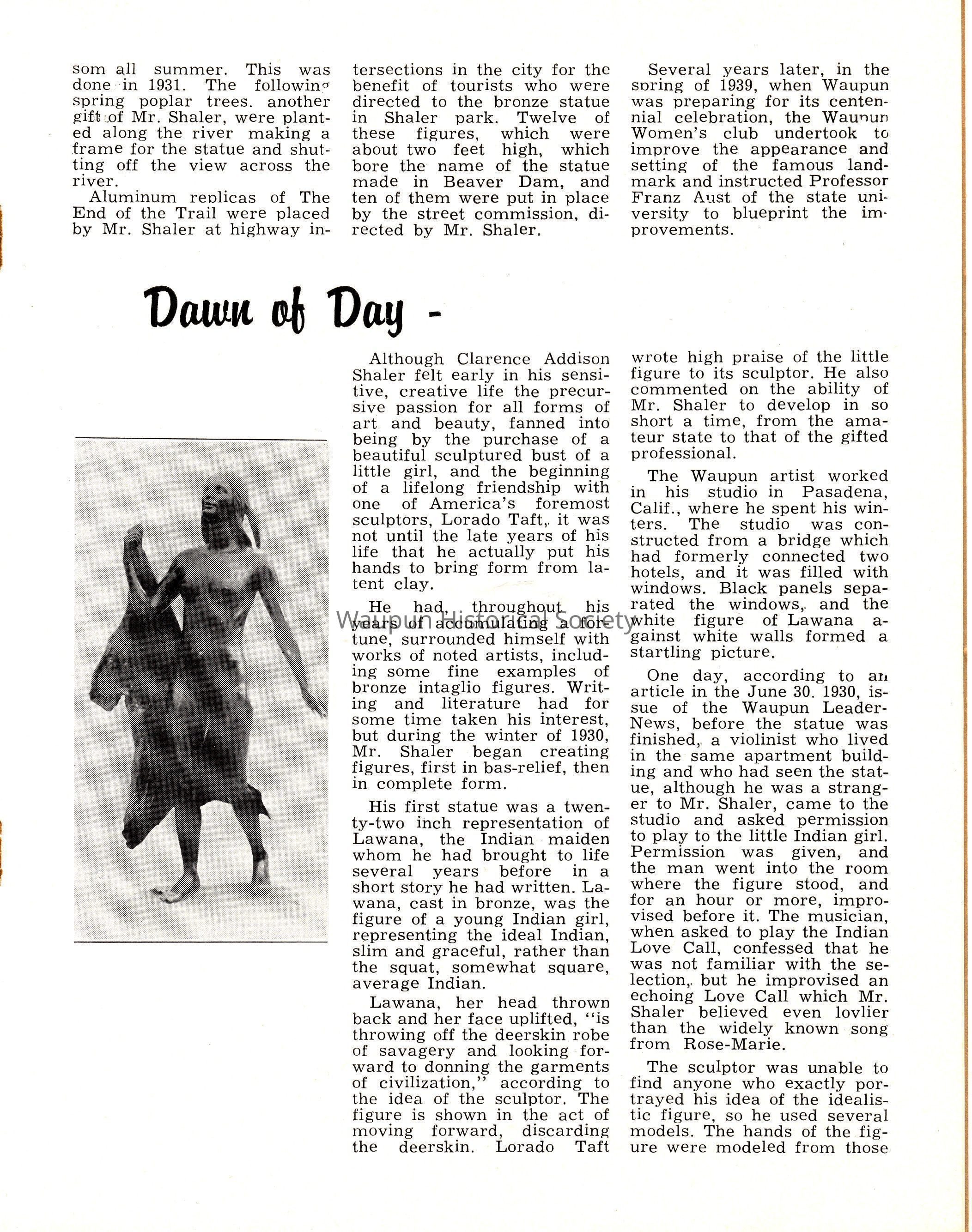 Several hundred persons gathered Sunday morning, Sept. 13, 1931, to witness the ceremonies which were held fully as much in honor of the sculptor as in tribute to the statue. Mr. Shaler, who had usually refused to make any appearance or to take part in programs relating to his gifts to the city, surprised everyone when he appeared and spoke briefly. Wishing for the city the fulfillment of all the hope symbolized in the statue, Mr. Shaler expressed his love for Waupun and his pleasure in presenting a memento of his regard. "Like this Indian maiden who is casting off the old garments to put on the new and who will ever look forward into the dawn of a new day of greater possibilities, so I hope the people of Waupun will look into the dawn of a new day of greater prosperity and happiness," he concluded.