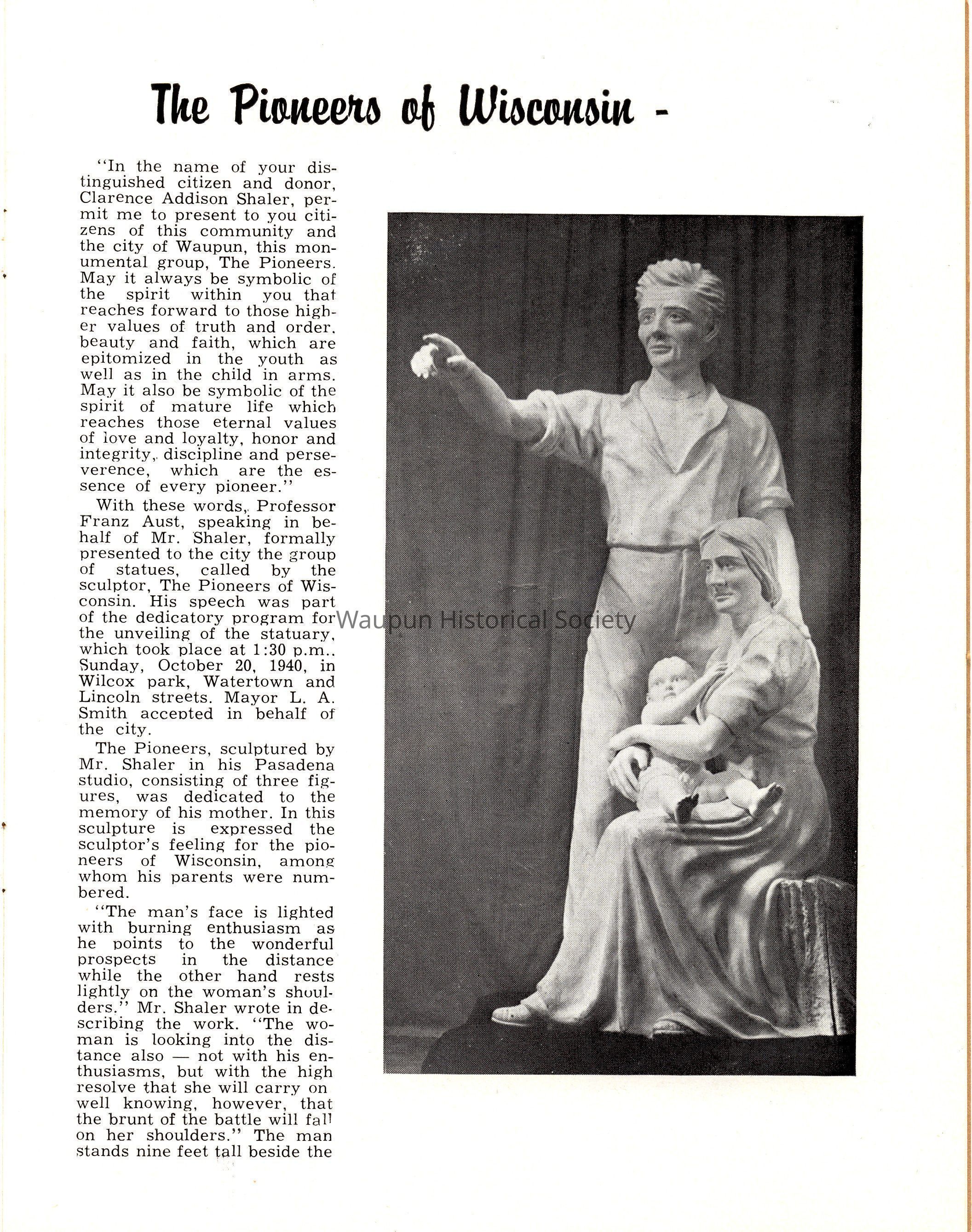 "In the name of your distinguished citizen and donor, Clarence Addison Shaler, permit me to present to you citizens of this community and the city of Waupun, this monumental group, The Pioneers. May it always be symbolic of the spirit within you that reaches forward to those higher values of truth and order, beauty and faith, which are epitomized in the youth as well as in the child in arms. May it also be symbolic of the spirit of mature life which reaches those eternal values of love and loyalty, honor and integrity, discipline and perseverence, which are the essence of every pioneer."