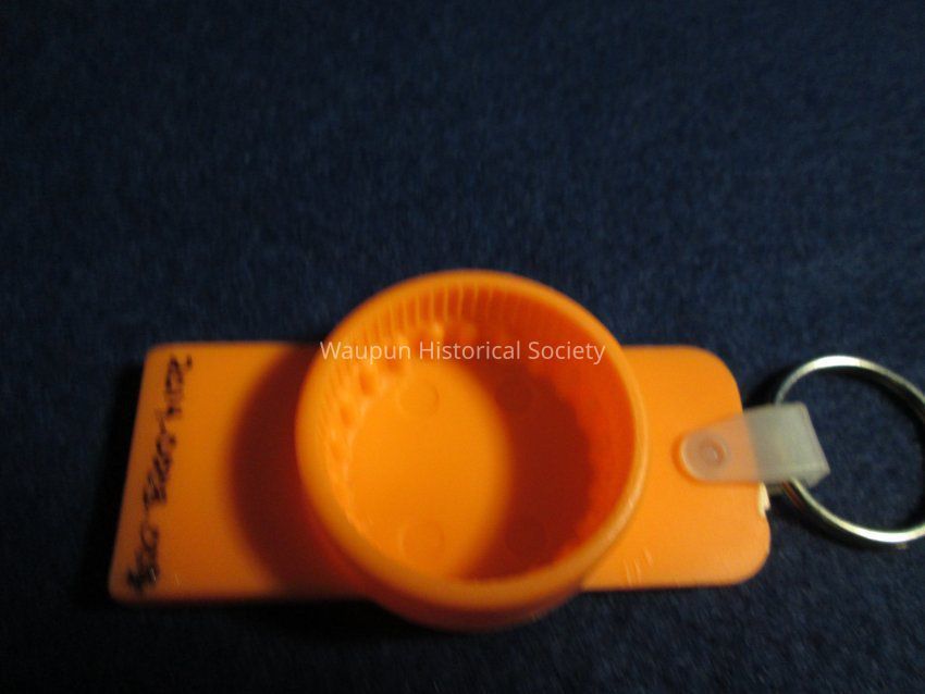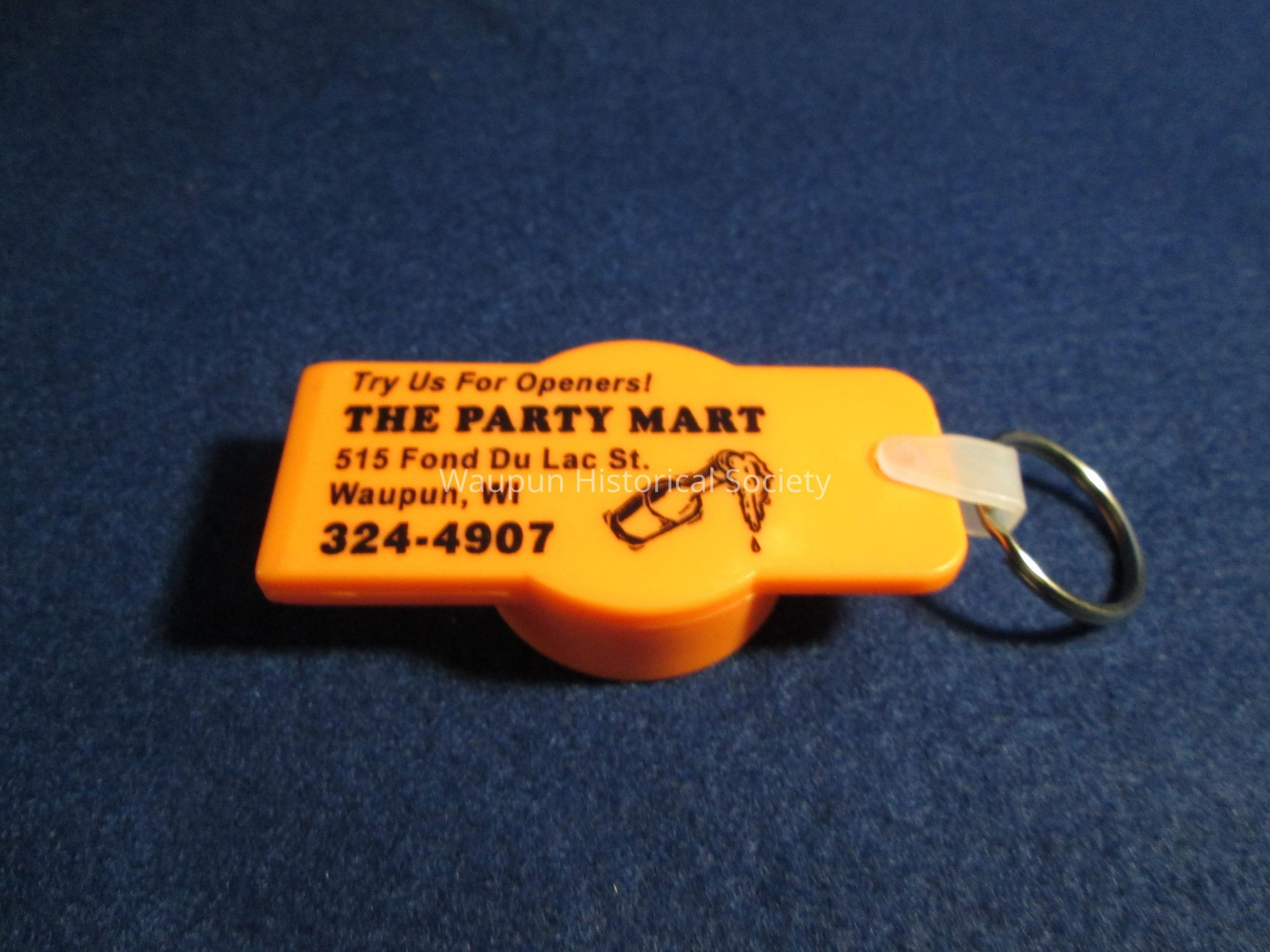 A Bottle Cap Opener Key Chain Orange in color with compliment of the Party Mart at 515 Fond Du Lac St. of Waupun Wis. Try us For Openers!Acquisition