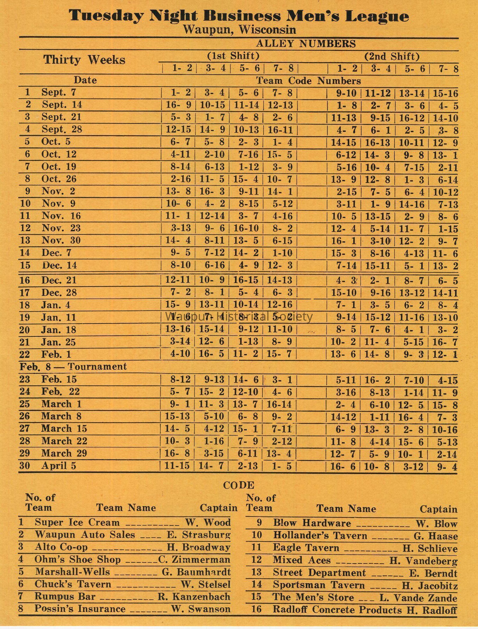 Super Ice Cream (located at 10 Fond du Lac St.), Waupun Auto Sales, Alto Co-op, Ohm's Shoe Shop, Marshall-Wells, Chuck's Tavern, Rumpus Bar, Possin's Insurance, Blow Hardware, Hollander's Tavern, Eagle Tavern, Mixed Aces, Street Department, Sportsman Tavern, The Men's Store, Radloff Concrete Products and Shell Fuel Oils and Gasoline, H. Vandeberg, Distributer.Acquisition