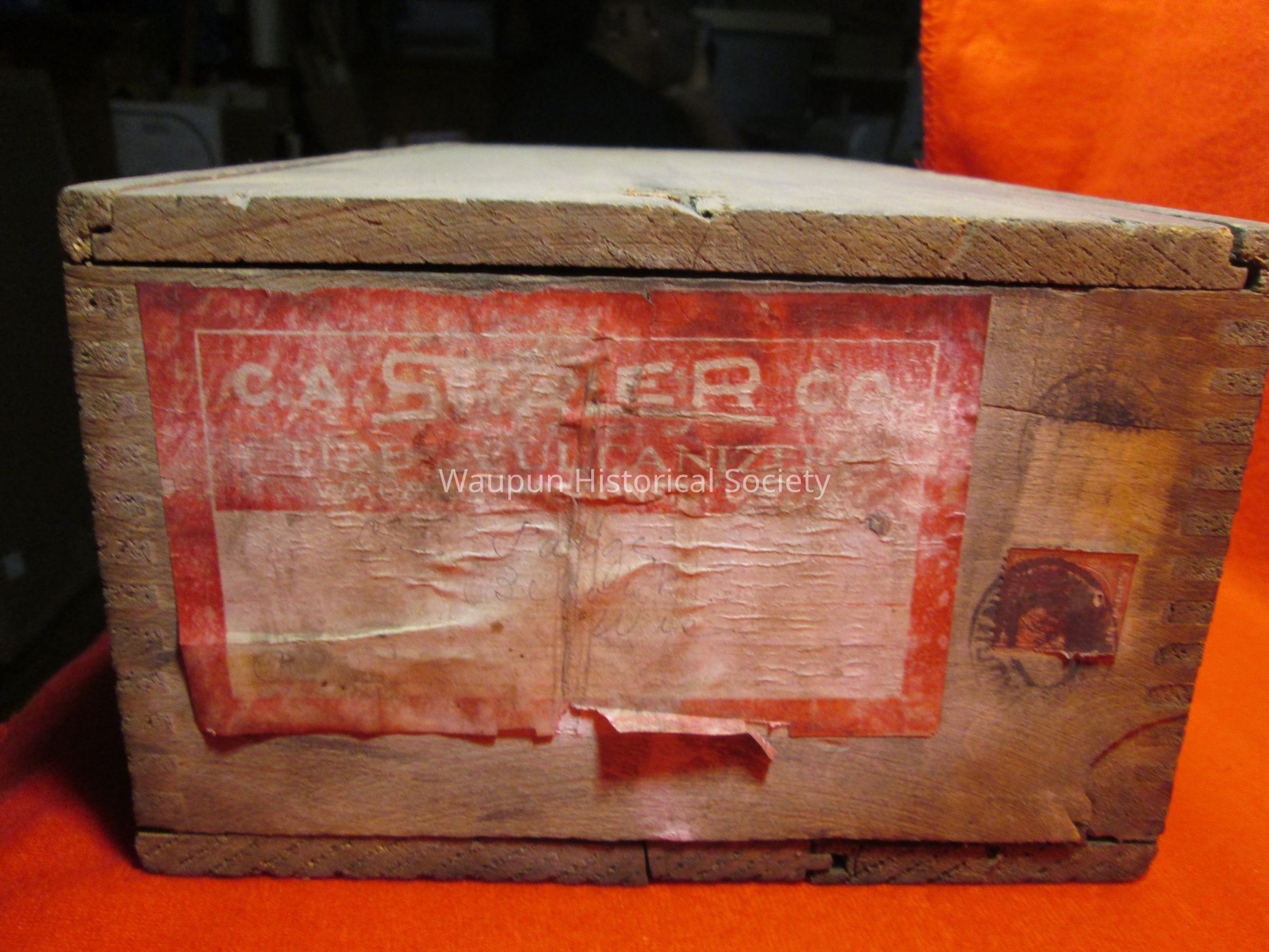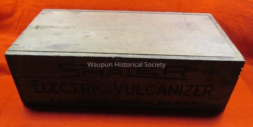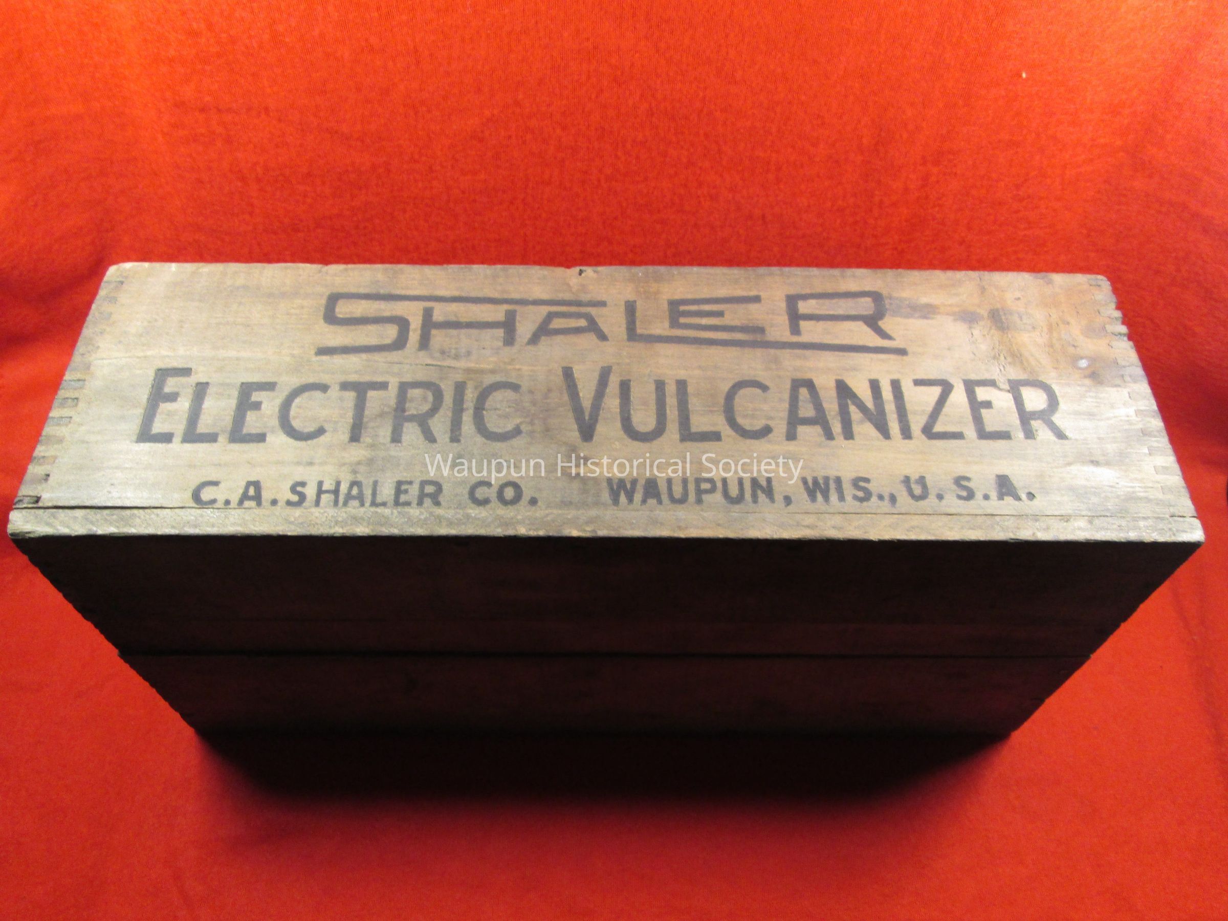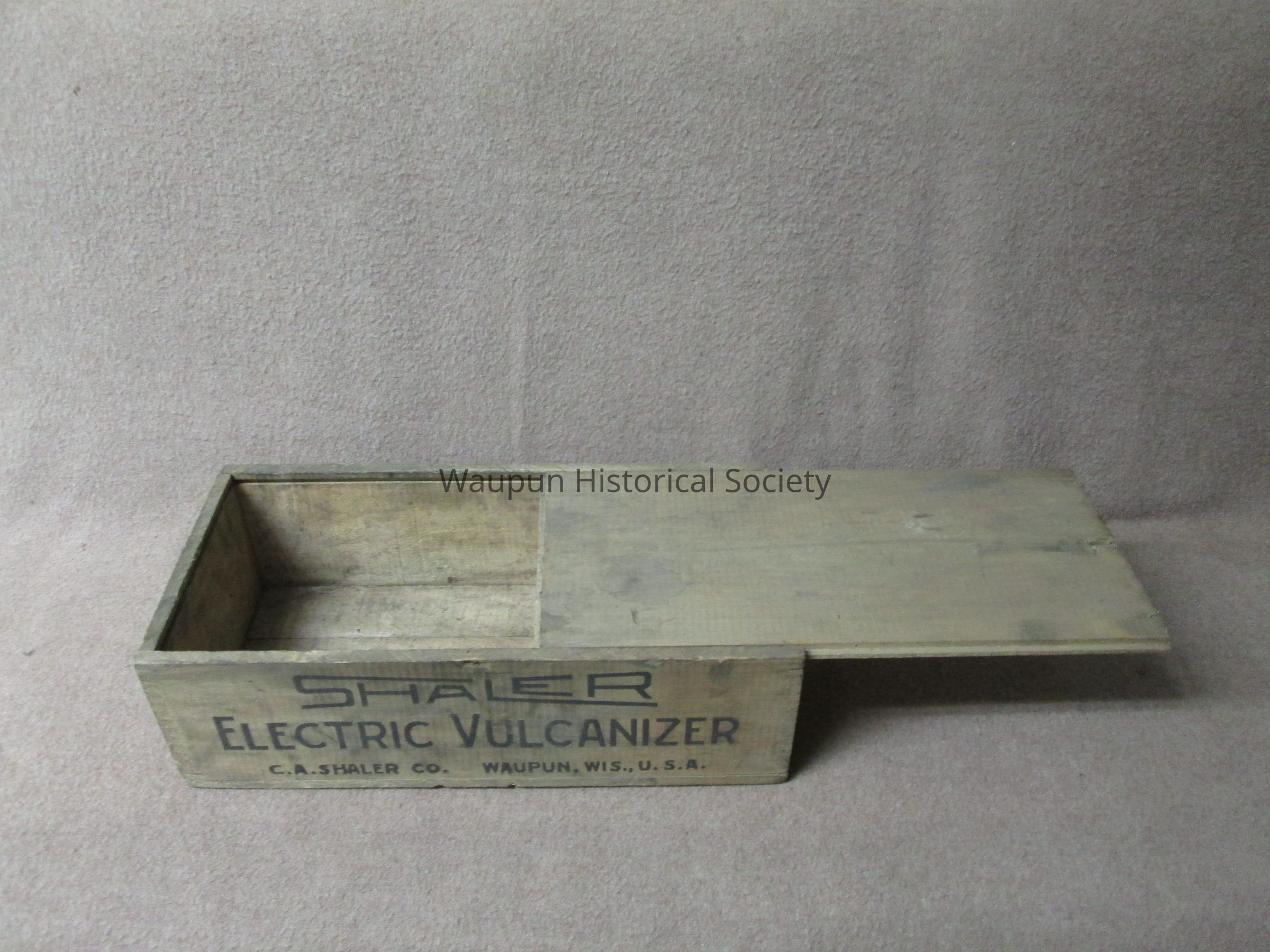 Wooden box for a Shaler Electric Vulcanizer. SHALER ELECTRIC VULCANIZER, C. A. Shaler Co., Waupun, Wis., U.S.A., stamped on it. There were 8 vulcanizer's tools and an instruction booklet inside. It also has an address label to C. E. Parge, Beloit, Wis. and a stamp. The lid slides out to open; appears to be handmade.Acquisition