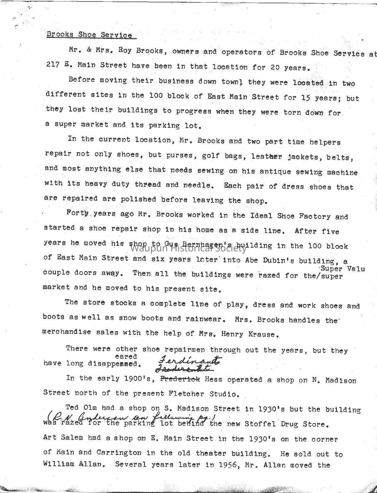 Historical information on Brooks Shoe Service for 1976 Bicentennial Celebration in Waupun, WI