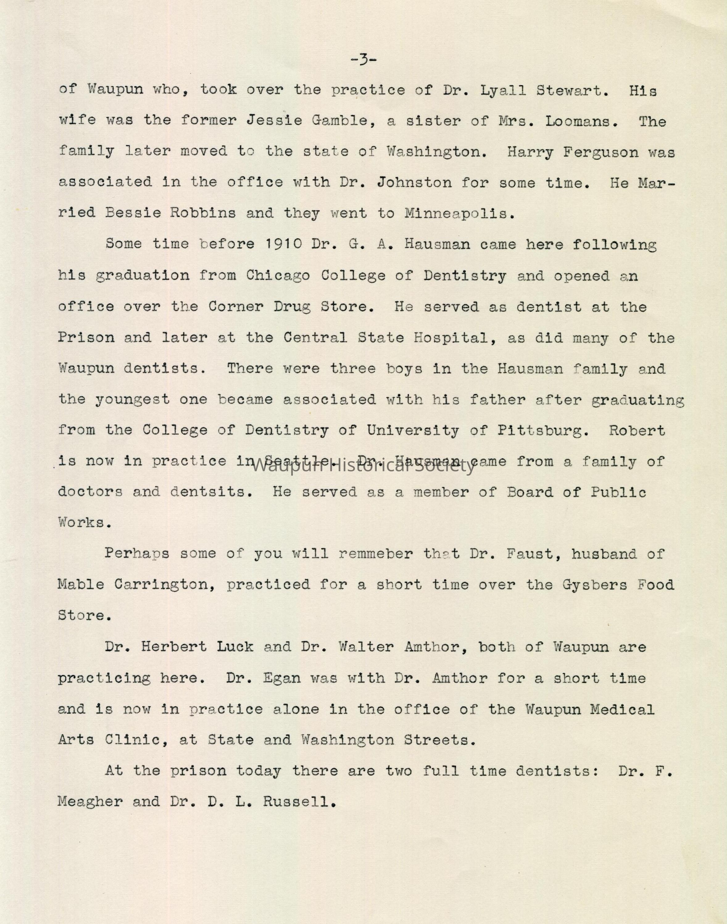 Some time before 1910 Dr. G. A. Hausman came here following his graduation from Chicago College of Dentistry and opened an office over the Corner Drug store. He served as dentist at the Prison and later at the Central State Hospital, as did many of the Waupun dentists. There were three boys in the Hausman family and the youngest one became associated with his father after graduating from the College of Dentistry of University of Pittsburgh. Robert is now in practice in Seattle. Dr. Hausman came from a family of doctors and dentists. He served as a member of Board of Public Works.