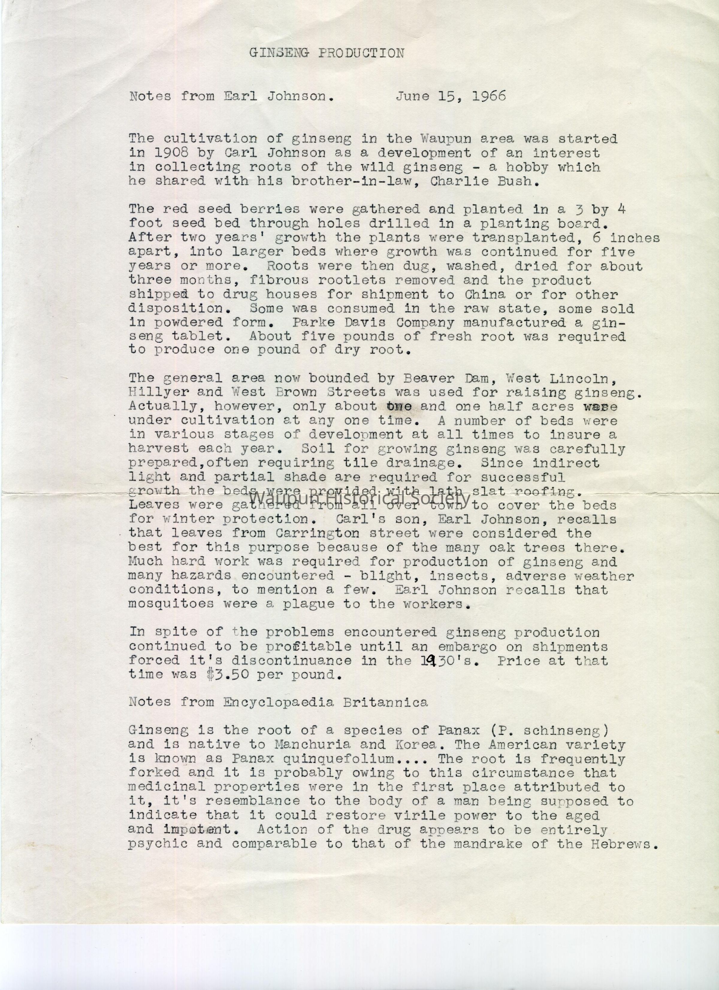 The cultivation of ginseng in the Waupun area was started in 1908 by Carl Johnson as a development of an interest in collecting roots of the wild ginseng - a hobby which he stared with his brother-in-law, Charlie Bush.