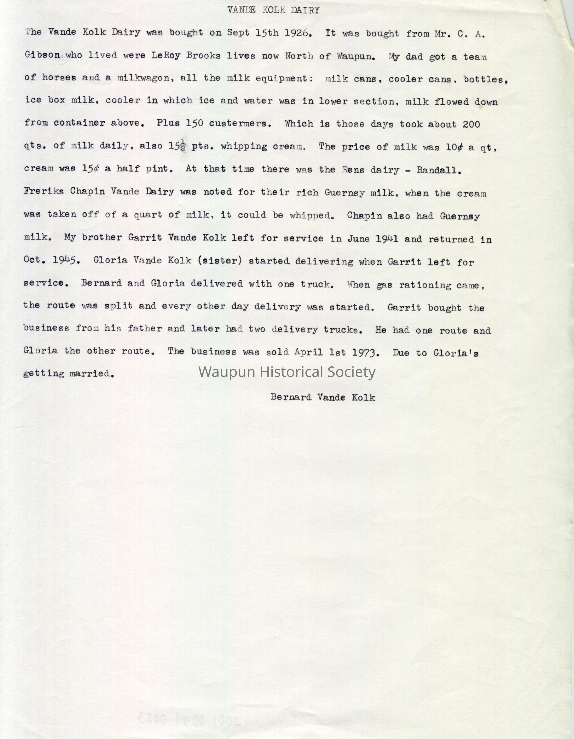 the VandeKolk Dairy was bought on Sept 15th1926. It was bought from Mr. C. A. Gibson who lived where LeRoy Brooks lives now North of Waupun. My dad got a team of horses and a milkwagon, all the milk equipment, milk cans, cooler cans, bottles, ice box milk, cooler in which ice and water was in lower section, milk flowed down from container above. Plus 150 custermers. Which in those days took about 200 quarts of milk daily, also 15 1/2 pints whipping cream. The price of milk was 10¢ a qt, cream was 15 cents a half -pint. At that time there was the Rens dairy - Randall. Freriks Chapin Vande Dairy was noted for their rich Guernsy milk, when the cream was taken off of a quart of milk, it could be whipped. Chapin also had Guernsy milk. My brother Garrit Vande Kolk left for service in June 1941 and returned in Oct. 1945. Gloria VandeKolk (sister) started delivering when Garrit left for service. Bernard and Gloria delivered with one truck. 'When gas rationing came, the route was split and every other day delivery was started. Garrit bought the business from his father and later had two delivery trucks. He had one route and Gloria the other route. The business was sold April 1st 1973. Due to Gloria's getting married.