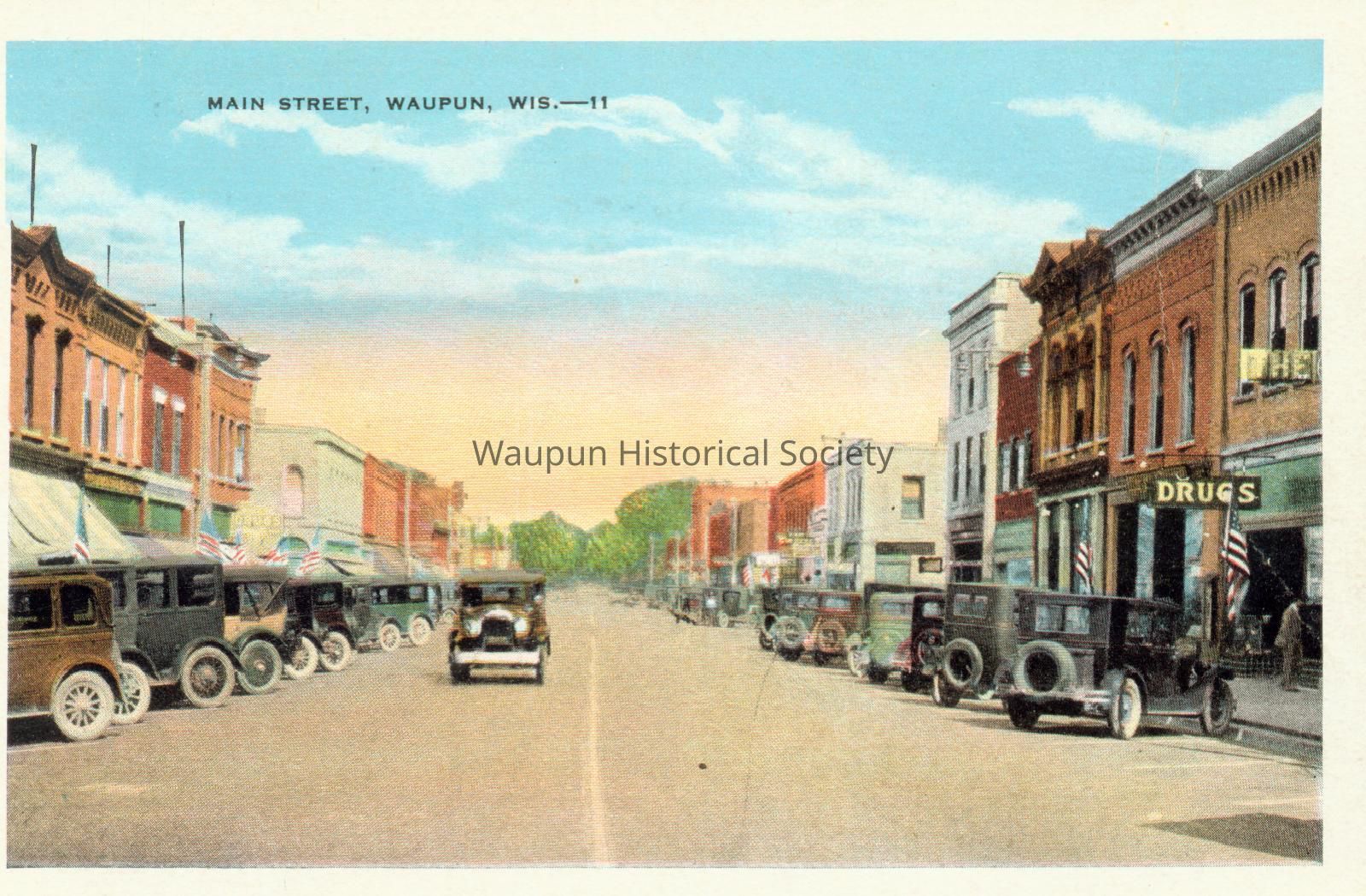 Postcard, Main Street in Waupun looking east. Date unkown.Acquisition