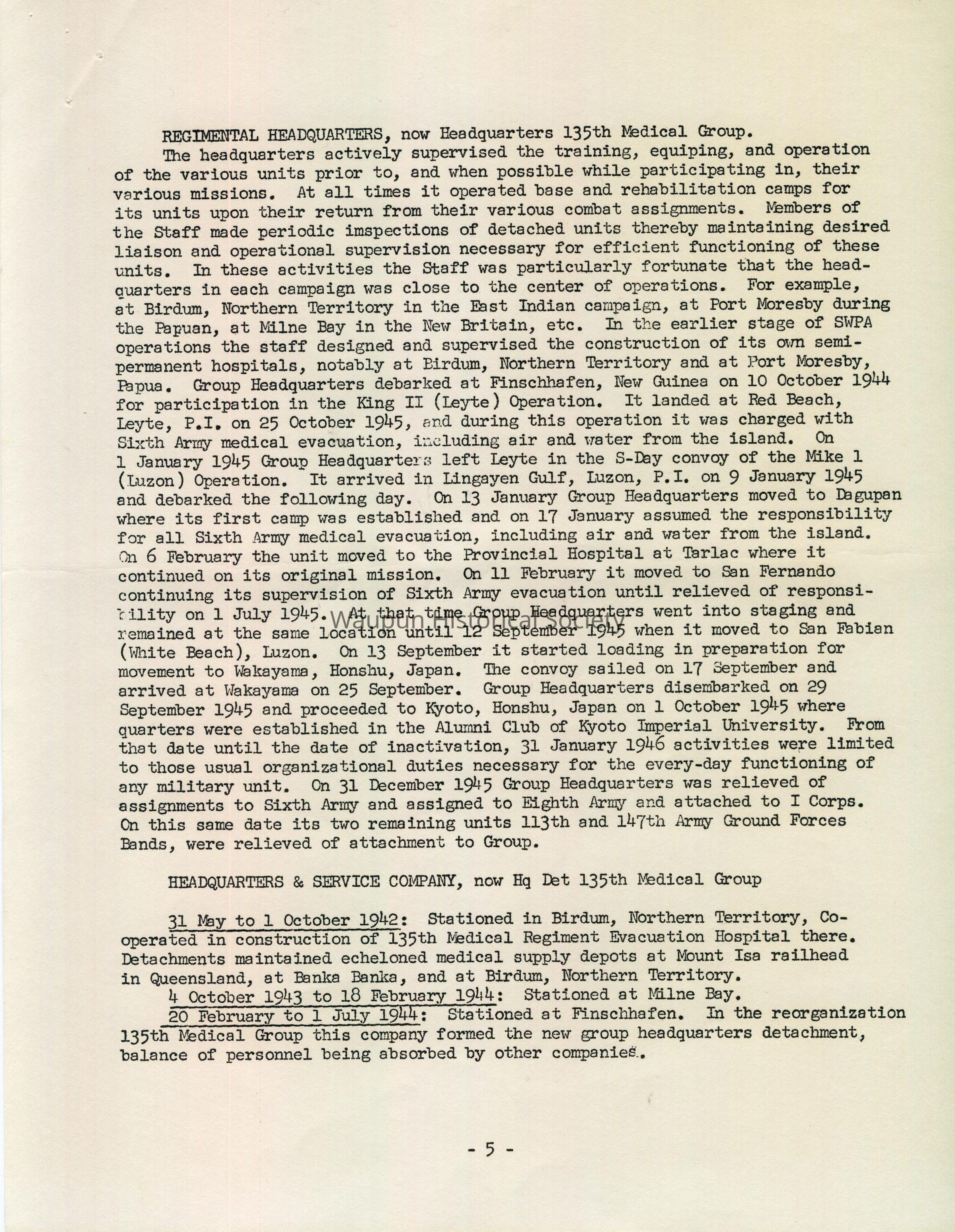 This is a pamphlet of the OFFICIAL OUTLINE OF THE HISTORY OF THE 135TH MEDICAL GROUP AND THE EVENTS THAT HAPPENED WHILE THEY WERE OVERSEAS.