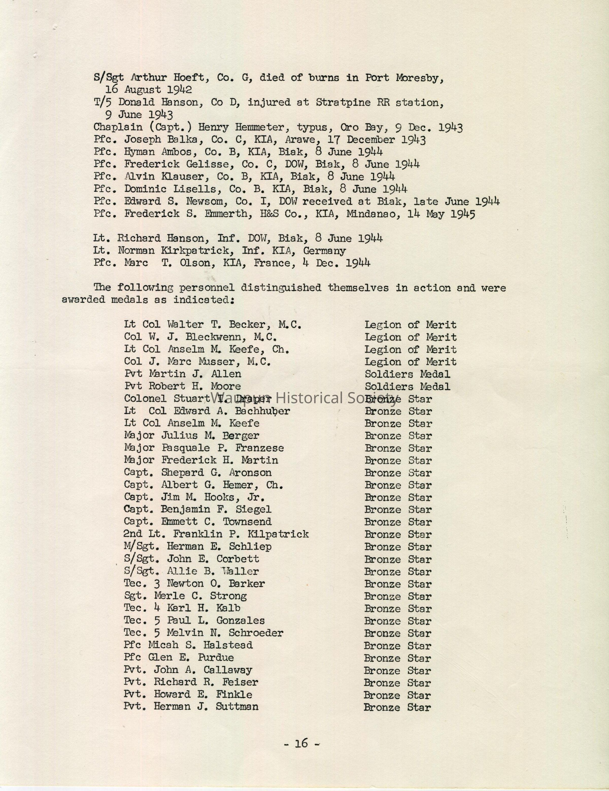 They are: James T. Parker, Gen. McArthur, William J. Bleckwenn, Marc J. Musser Jr., Stuart I. Draper, James R. Moore, Arthur Hoeft, Donald Hanson, Henry Hemmeter, Joseph Balka, Hyman Ambos, Frederick Gelisse, Alvin Klauser, Dominic Lisells, Edward S. Newsom, Frederick S. Emmerth, Richard Hanson, Norman Kirkpatrick, Marc T. Olson, Walter T. Becker, Anslem M. Keefe, Martin Allen J., Robert H. Moore, Stuart I. Draper, Edward A. Bachhuber