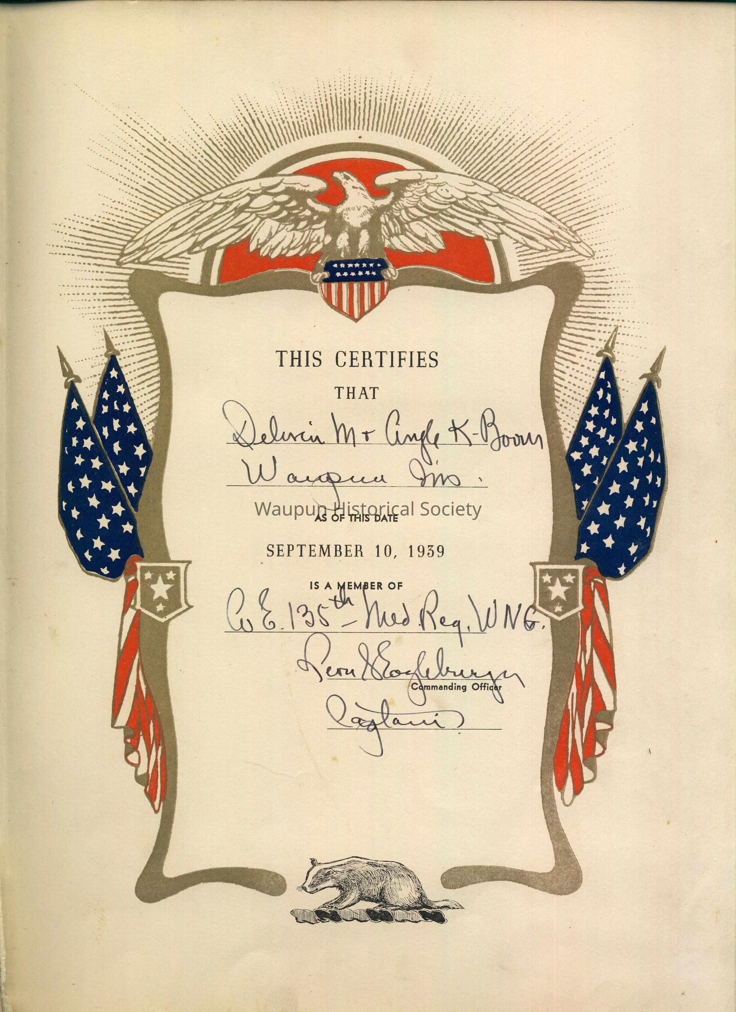 It has a Certificate in it that states that Delwin M and Avyle K. Boom of Waupun, WI as of this date of September 10, 1939 is a member of C. E. 135th Medical Regiment of WNG, signed by the Commanding Officer, Leon Slegleburger. (spelling unsure).