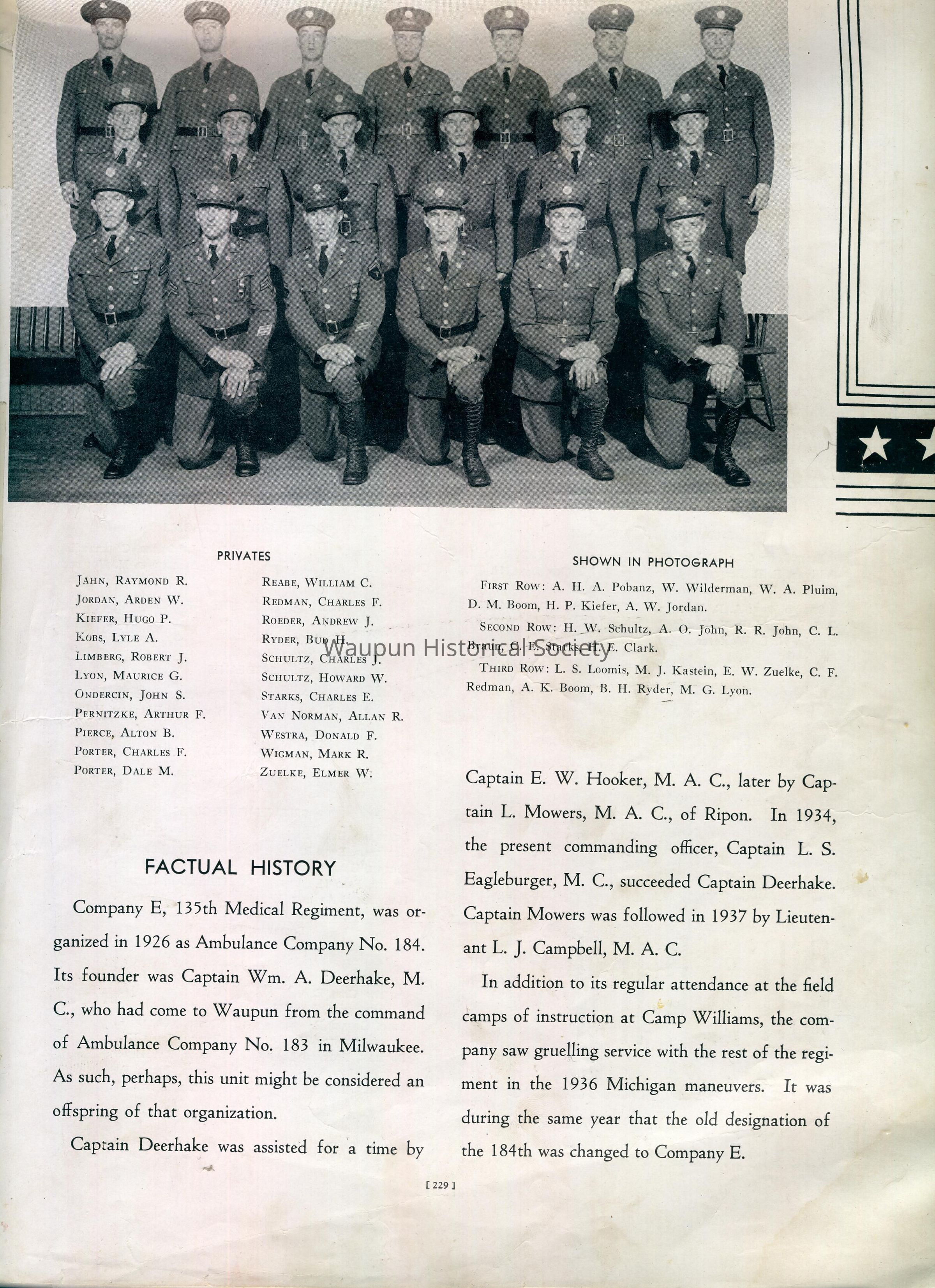 Company E, 135th Medical regiment, was organized in 1926 as Ambulance Company No. 184. It founder was Captain Wm. A. Deerhake, M. C., who had come to Waupun from the command of Ambulance Company No. 183 in Milwaukee. As such, perhaps, this unit might be considered an offspring of that organization.