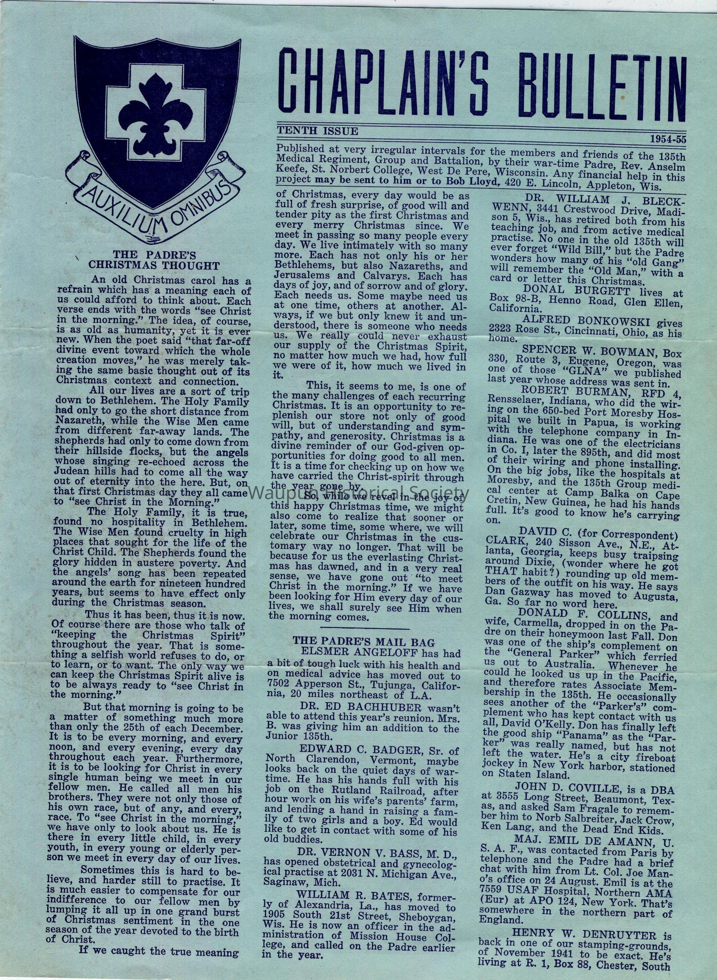 The Chaplain's Bulletin is a pamphlet that is published at very irregular intervals for the members and friends of the 135th Medical Regiment, Group and Battalion by their war-time Padre,