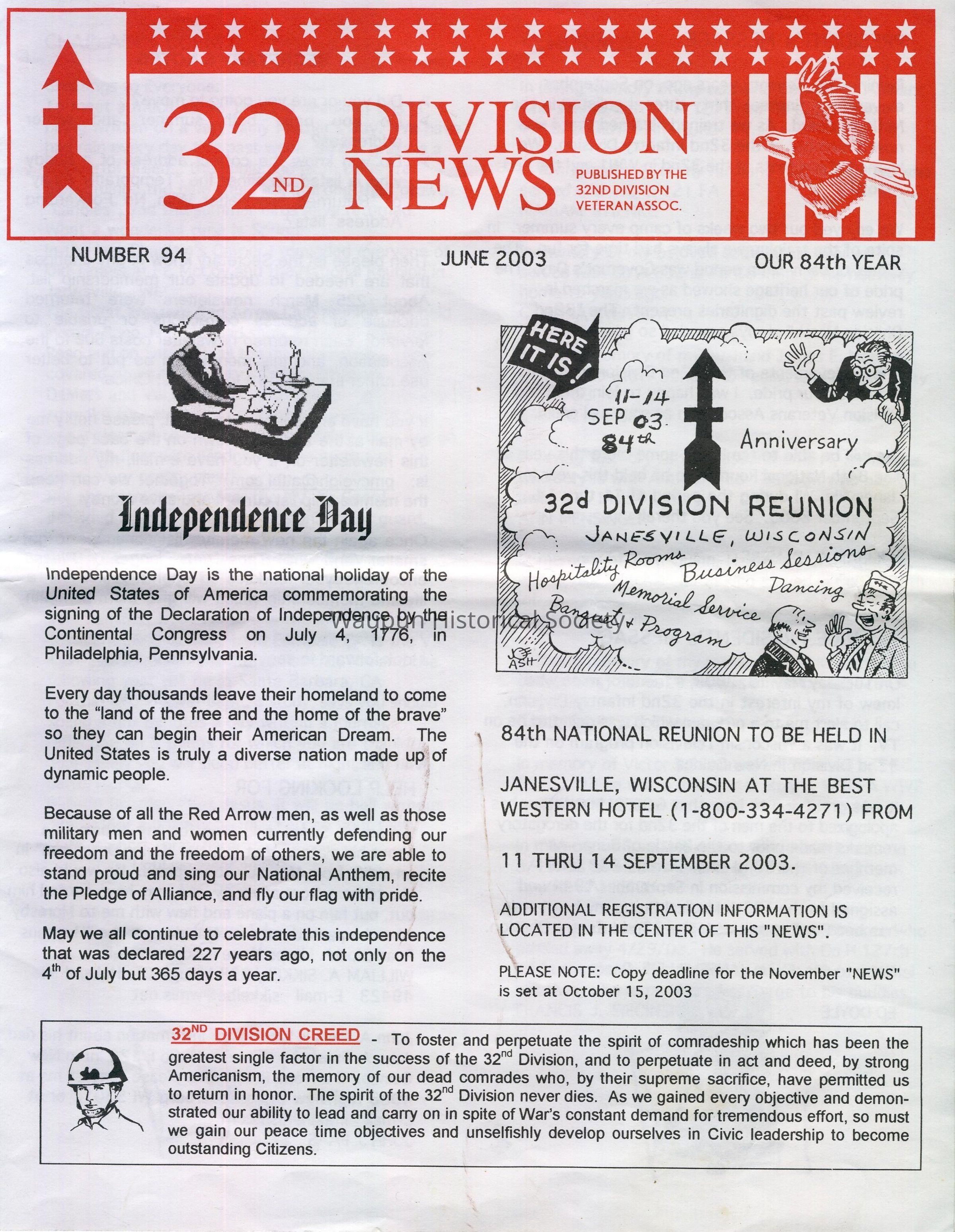 This is a pamphlet of the 32nd DIVISION NEWS, published by the 32nd Division Veteran Association. Number 94 of June 2003.