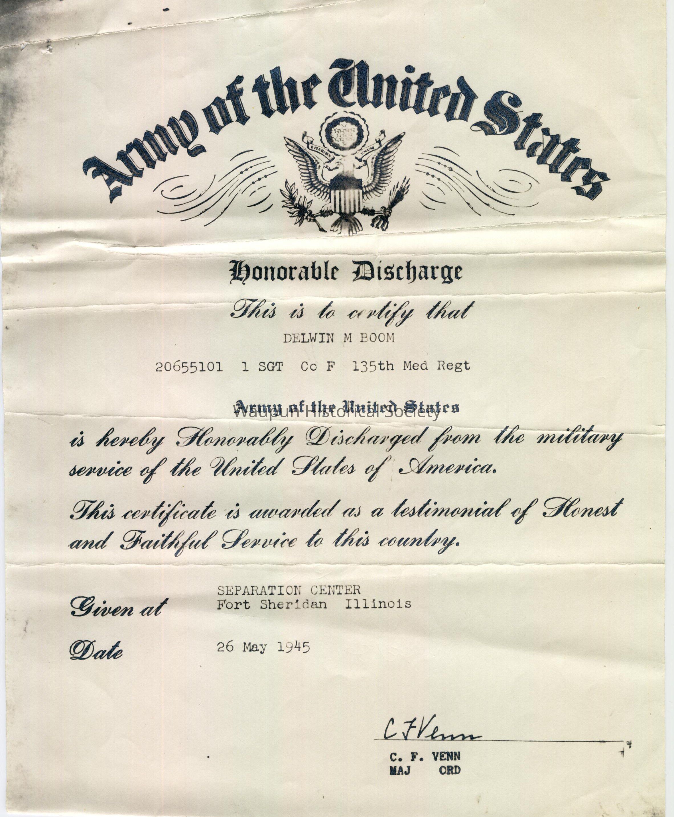 Military, Discharge Certificate, Delwin M BoomEntry/Object ID