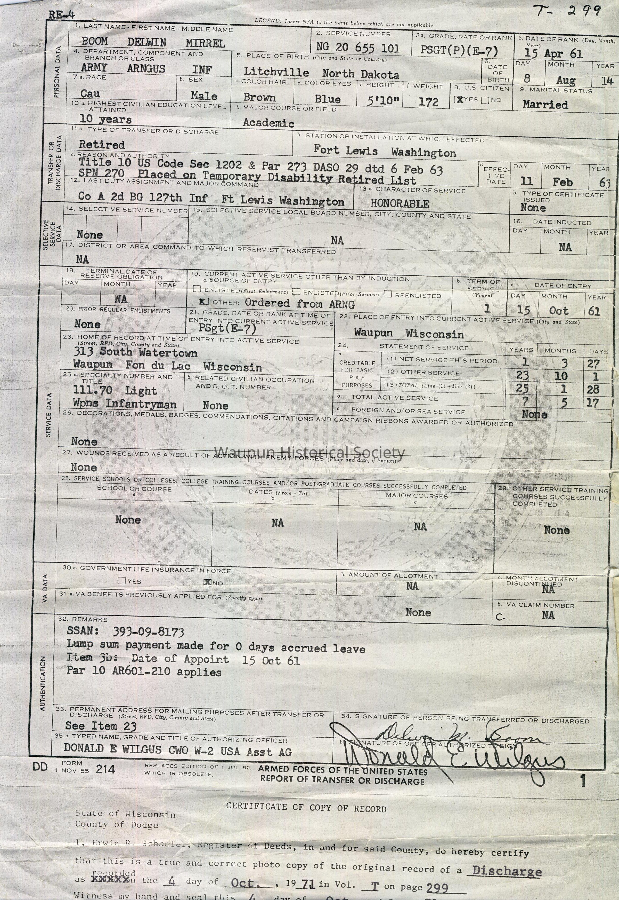 Military, Discharge Long Form, Delwin Mirrel BoomEntry/Object ID