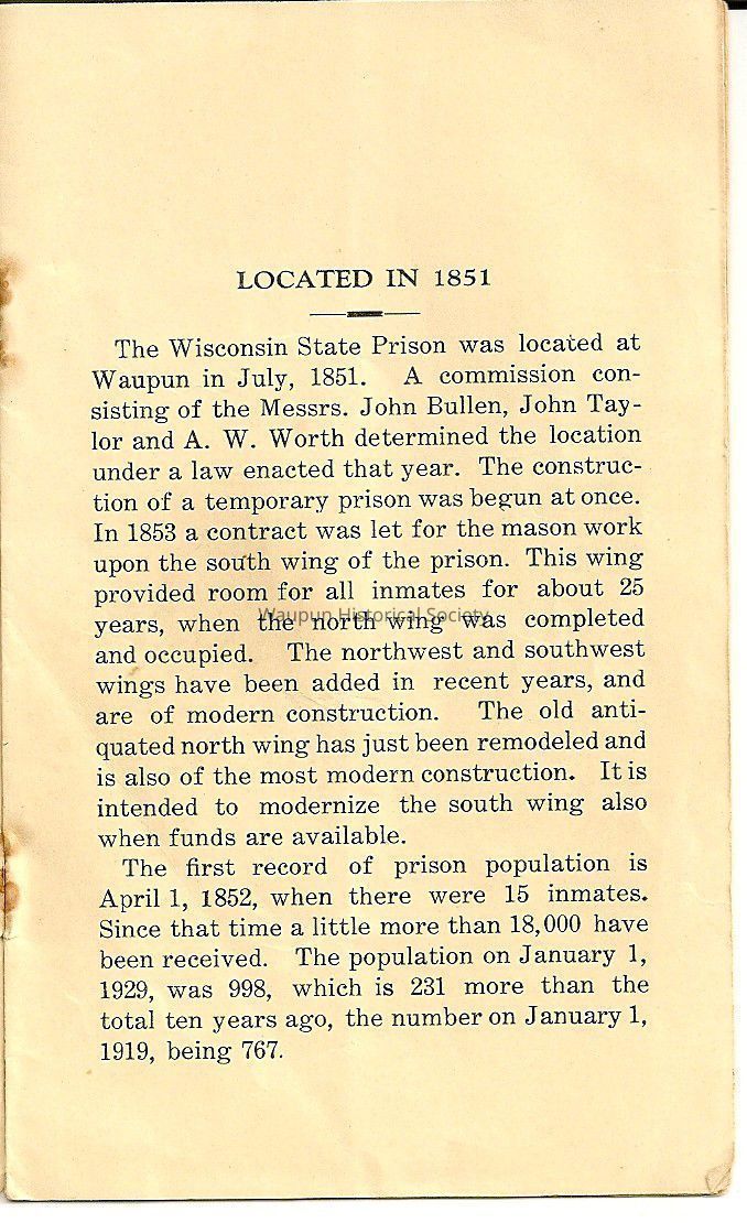 The Wisconsin State Prison was located at Waupun in July, 1851. A commission consisting of the Messrs. John Bullen, John Taylor and A. W. Worth determined the location under a law enacted that year. The construction of a temporary prison was begun at once. In 1853 a contract was let for the mason work upon the south wing of the prison. This wing provided room for all inmates for about 25 years, when the north wing was completed and occupied. The northwest and southwest wings have been added in recent years, and are of modern construction. The old antiquated north wing has just been remodeled and is also of the most modern construction. It is intended to modernize the south wing also when funds are available.