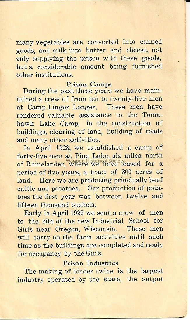 In April 1928, we established a camp of forty-five men at Pine Lake, six miles north of Rhinelander, where we have leased for a period of five years, a tract of 800 acres of land. Here we are producing principally beef cattle and potatoes. Our production of potatoes the first year was between twelve and fifteen thousand bushels.