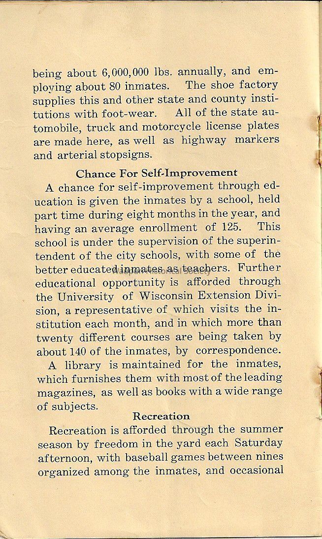 A chance for self-improvement through education is given the inmates by a school, held part time during eight months in the year, and having an average enrollment of 125. This school is under the supervision of the superintendent of the city schools, with some of the better educated inmates as teachers. Further educational opportunity is afforded through the University of Wisconsin Extension Division, a representative of which visits the institution each month, and in which more than twenty different courses are being taken by about 140 of the inmates, by correspondence.