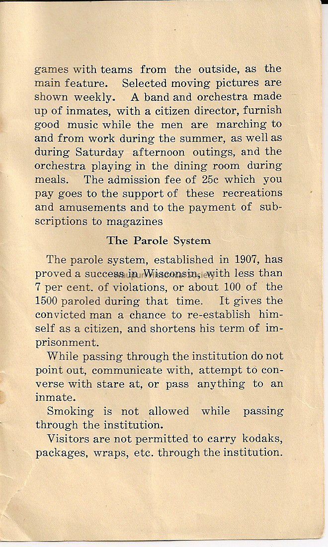 games with teams from the outside, as the main feature. Selected moving pictures are shown weekly. A band and orchestra made up of inmates, with a citizen director, furnish good music while the men are marching to and from work during the summer, as well as during Saturday afternoon outings, and the orchestra playing in the dining room during meals. The admission fee of 25c which you pay goes to the support of these recreations and amusements and to the payment of subscriptions to magazines.