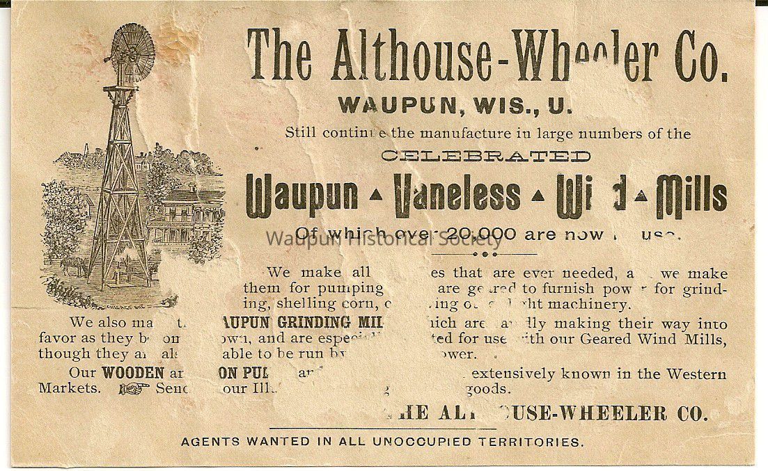 Althouse-Wheeler Co. advertisement. This as was from O. Wheeler, General Agent, Waverly, Iowa. Indicates that Althouse-Wheeler made Celebrated Waupun Vaneless Wind Mills