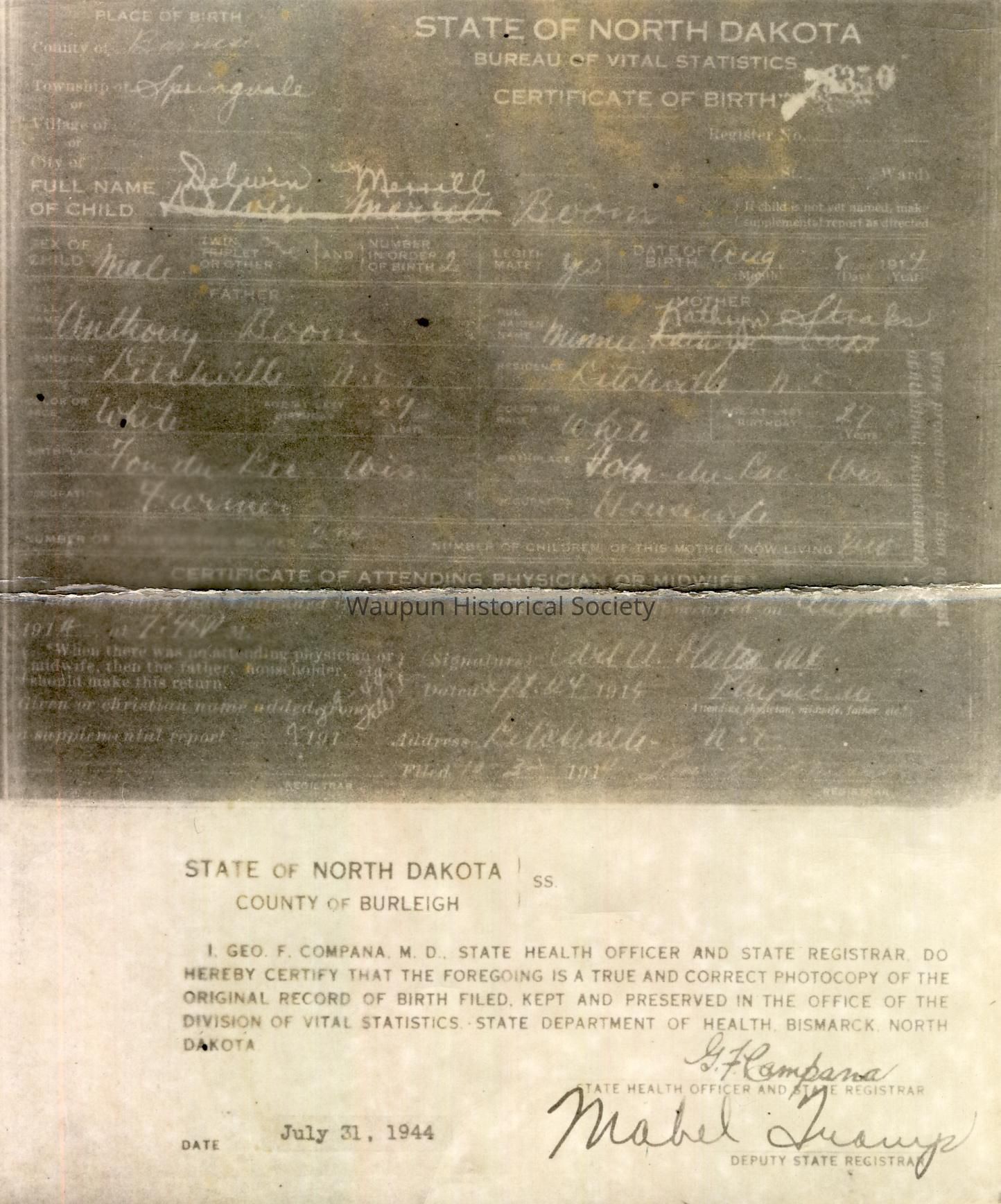 Birth Certificate, Delwin Merrill BoomEntry/Object ID