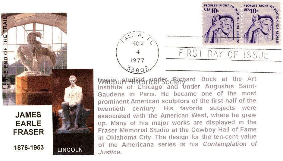 First day commemorating James Earle Fraser, 1876 - 1953. "Fraser studied under Richard Bock at the Art Institute of Chicago and under Augustus Saint Gaudens in Paris. He became one of the most prominent American sculptors of the first half of the twentieth century. His favorite subjects were associated with the American West, where he grew up. Many of his major works are displayed in the Fraser Memorial Studio at the Cowboy Hall of Fame in Oklahoma City. The design for the ten-cent value of the Americana series is his Contemplation of Justice." Fraser did The End of the Trail in Waupun. It would be logical that the postage stamps on the envelope were designed by him. The date of the postmark is November 4, 1977. Notice also that Abraham Lincoln is the other work shown.Acquisition