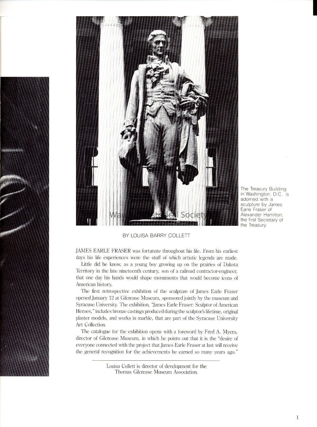Every American who has toured Washington, D. C. has had many opportunitics to View the work of James Earle Fraser. His first important commission was a statue of Alexander Hamilton, the first Secretary of the Treasury for the South Plaza of the Treasury Building, a work unveiled in 1923.