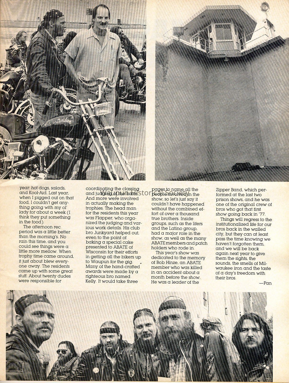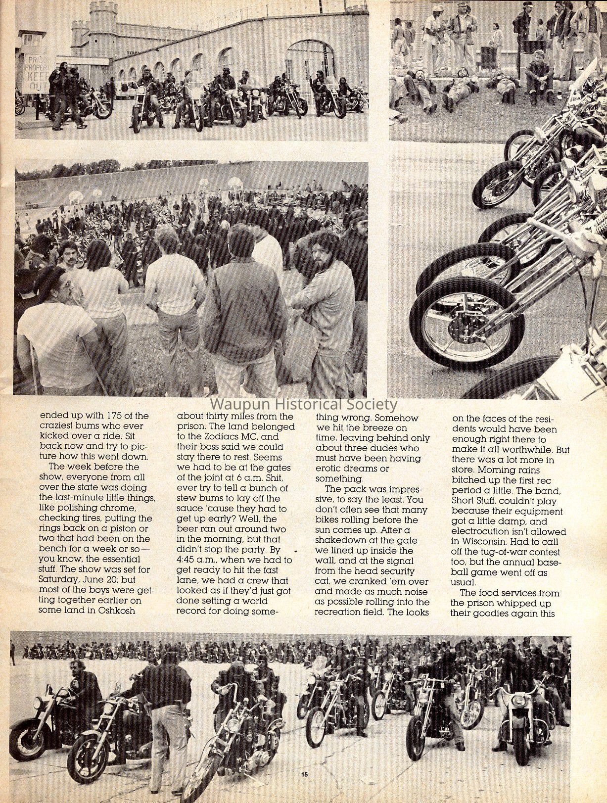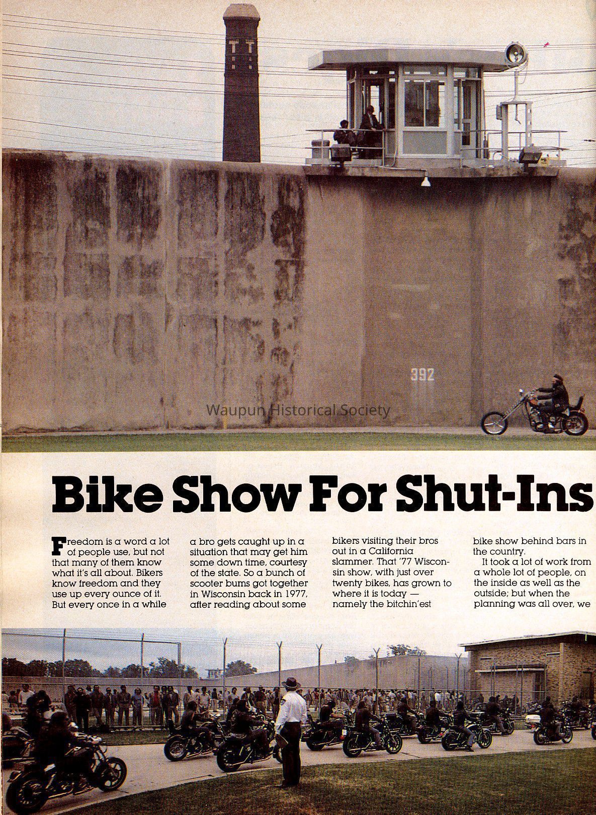 Bikers visit the Waupun Correctional Institution. Taken from the Easyriders, Number 101, November 1981. Note: not all of the articles in the magazine were OCRed and put into PastPerfect.