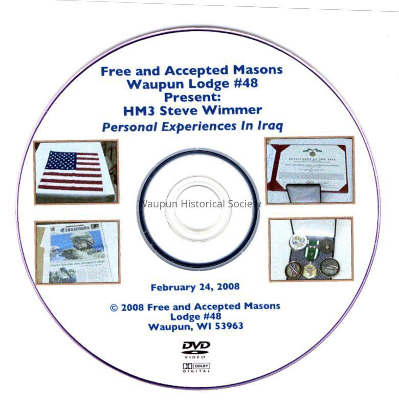 2 DVDs of a program given at the Masonic Lodge for breakfast on Sunday, February 24, 2008. Mr. Steve Wimmer gave the program and told of his personal experiences in Iraq. The lodge holds the copyright on the DVD but gives the Waupun Historical Society the right to permit researchers to view the DVD, make notes of the program and exchange information.