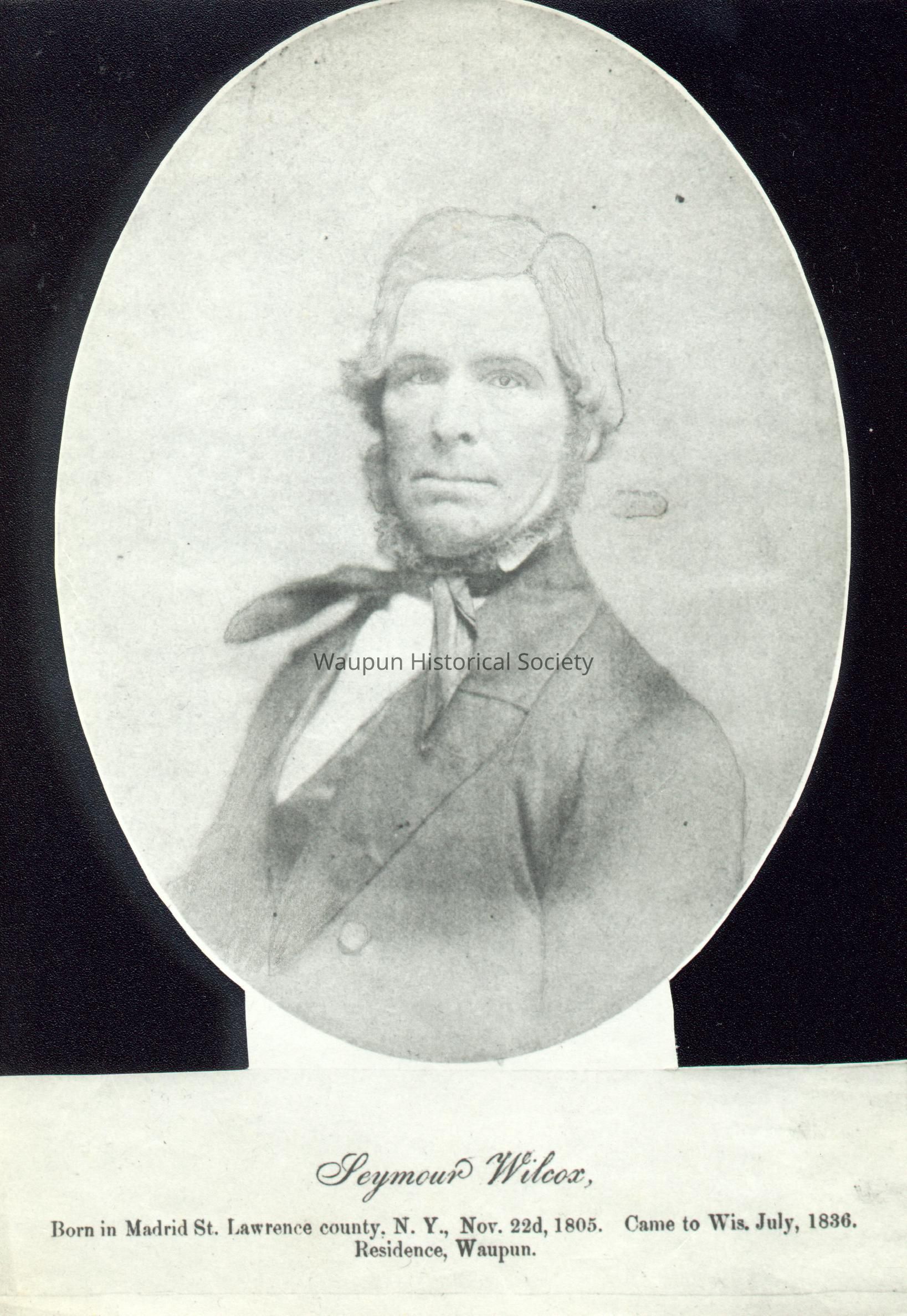 Information on the front indicated: Seymour Wilcox. Born in Madrid St. Lawrence County, N. Y., Nov. 22d, 1805. Came to Wis. July, 1836, Residence, Waupun.