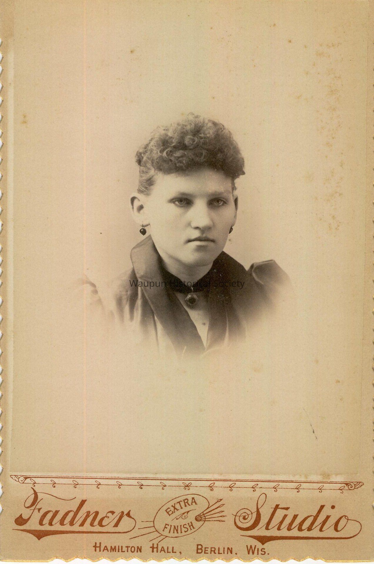 Cabinet Card, Alice Cheney Baldwin, daughter of John Cheney. Undated. C. C. Cheney was Vice President of Dodge County Mutual Insurance Company in 1858. Photographer: Fadner Studio, Hamilton Hall, Berlin, WI.
