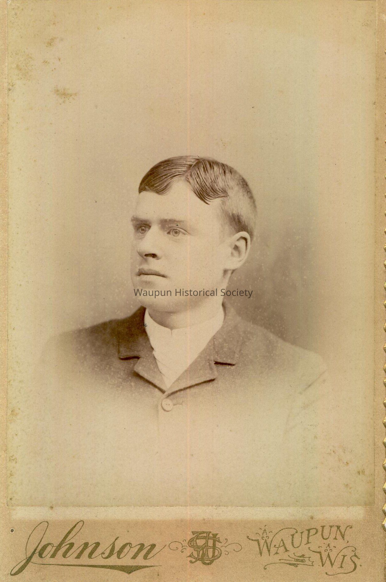 Cabinet Card, Johnson, Photograph of Edgar Hazen, son of Edgar and Sarah Hazen. Undated. Edgar Hazen lived at 434 E. Jefferson St. Not sure if this was father or son living at this address in 1910. Photographed by A. Stanley Johnson, Waupun. Also notes on the back "Mrs. Margaret McKesson's father." Brother of Lina Hazen Davison.
