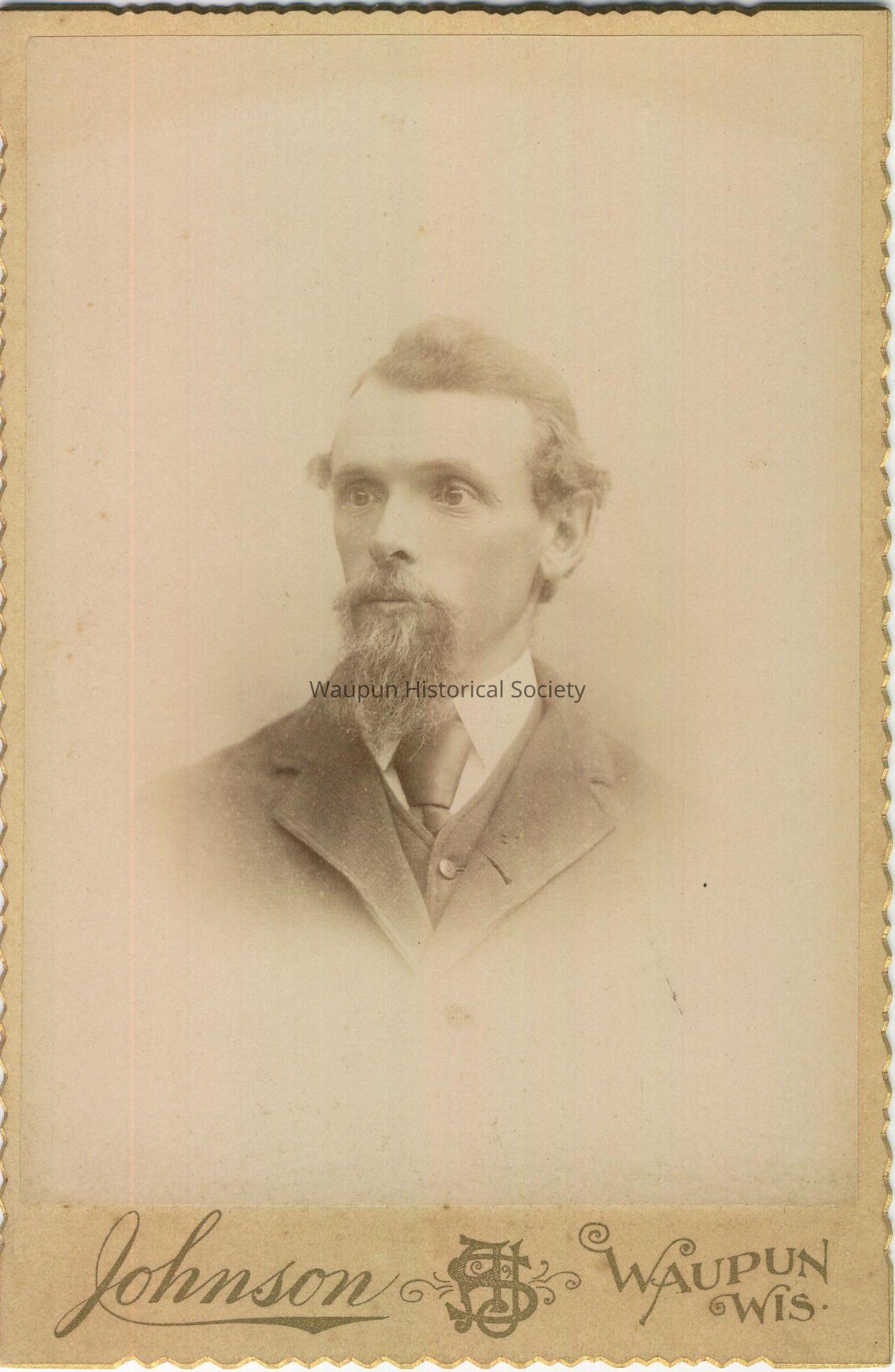 Cabinet Card, Johnson, Photograph of Frank Pinkerton. Undated. Photographed by Stanley Johnson in Waupun. Perhaps married to Helen Chase Pinkerton. The back of card has this writing: "Lives across the street from Grandpa Rogers." The way this is worded indicates that these photographs are from the George Ward Rogers Family.