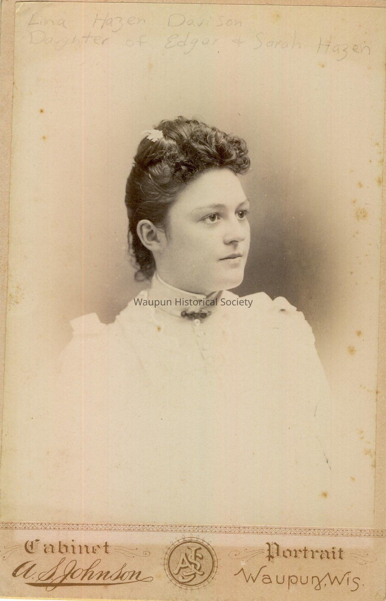 Cabinet Card, Johnson, Photograph of Lina Hazen Davison, daughter of Edgar and Sarah Hazen. Edgar Hazen lived at 434 E. Jefferson St. There were a number of Hazens and Davisons living in Waupun according to the 1910 City Directory. Davison Theatre was at 503 E. Main; Davison & Church sold groceries at 410 E. Main. (A.M. Davison). Photo by Stanley Johnson. Mrs. Davison looks to be about 20 years old in the picture, dating this to the mid-1890s. Her son Edgar C. "Bugg" Davison was born in 1900.
