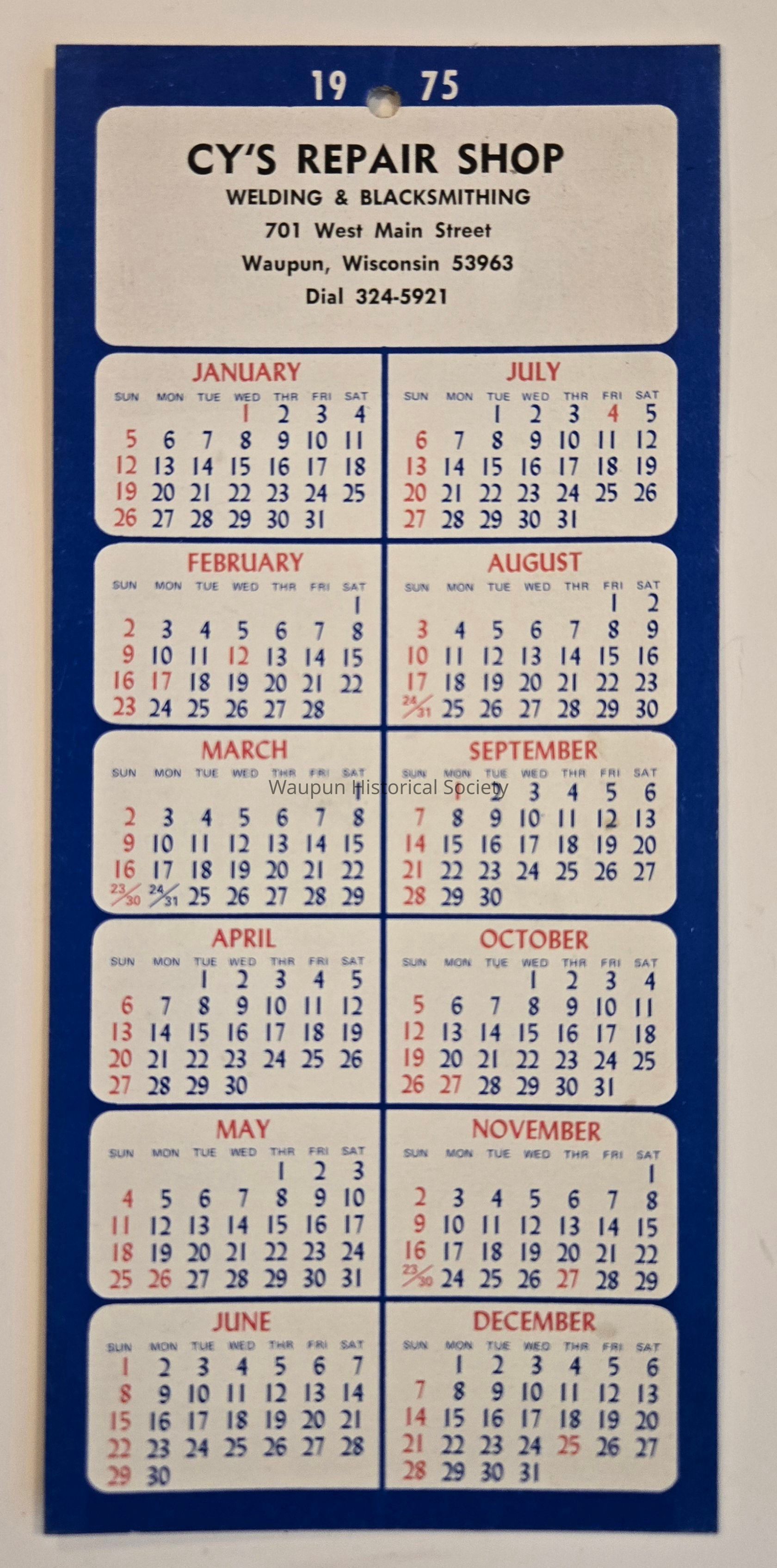 Calendar, Cy's Repair Shop, 1975