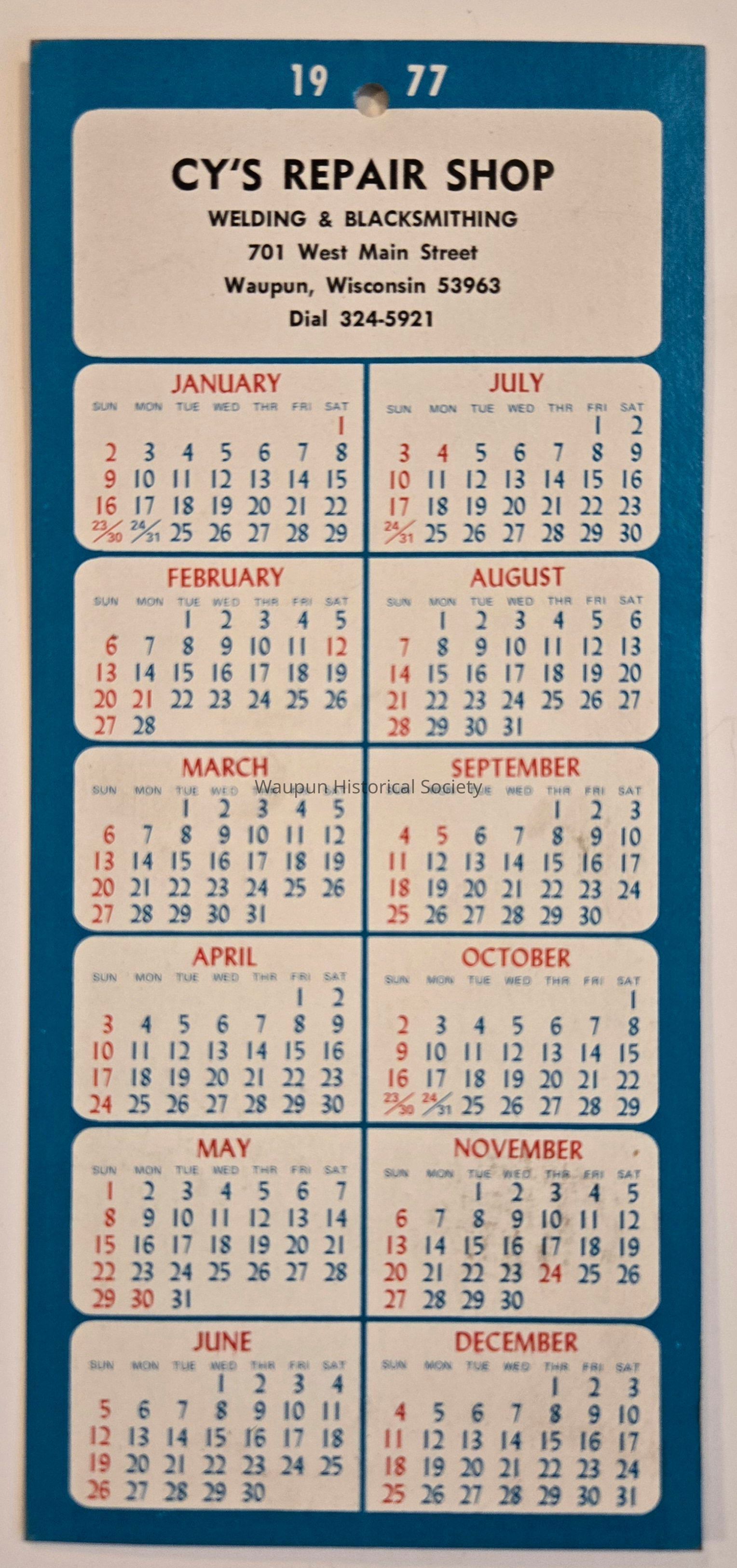 Calendar, Cy's Repair Shop, 1977
