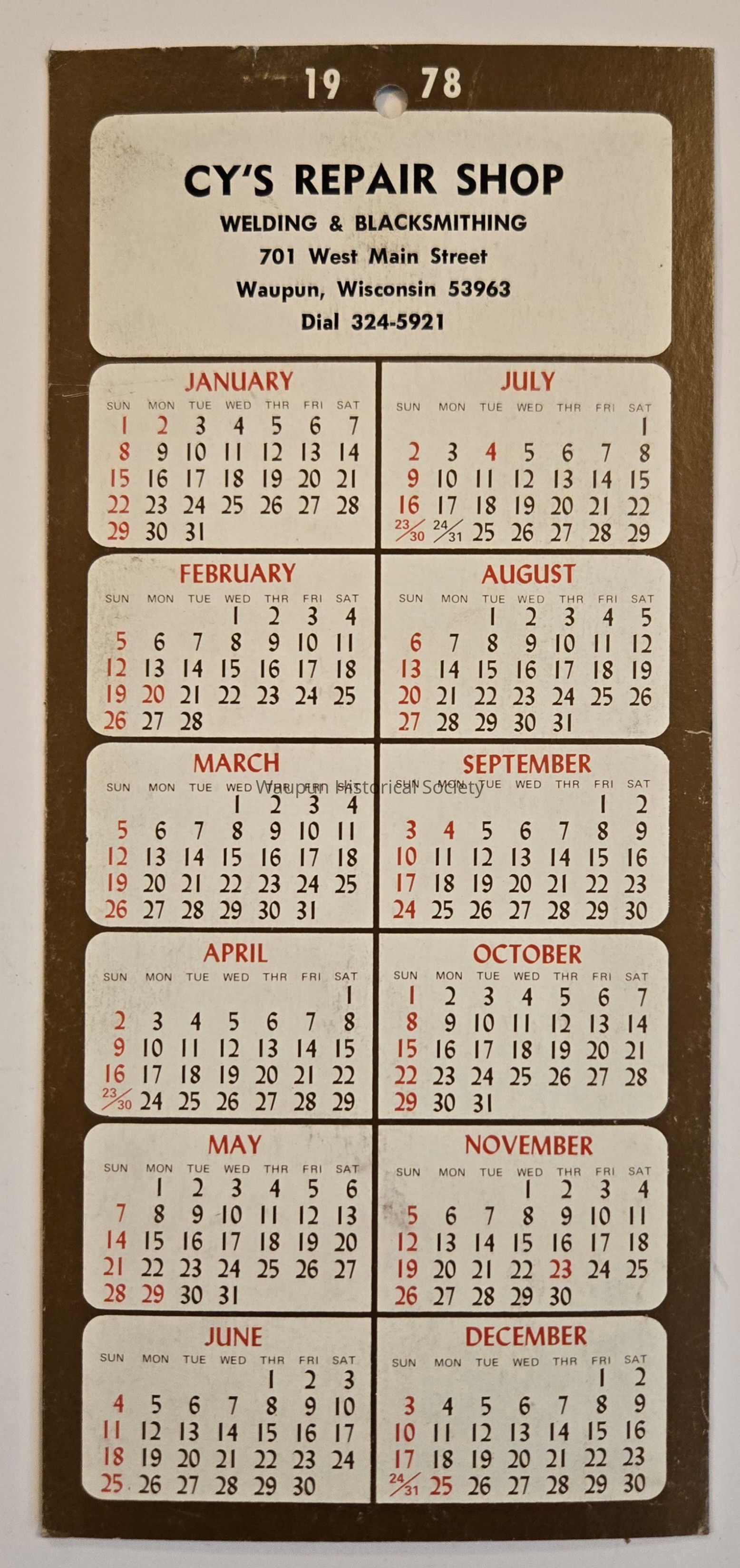 Calendar, Cy's Repair Shop, 1978