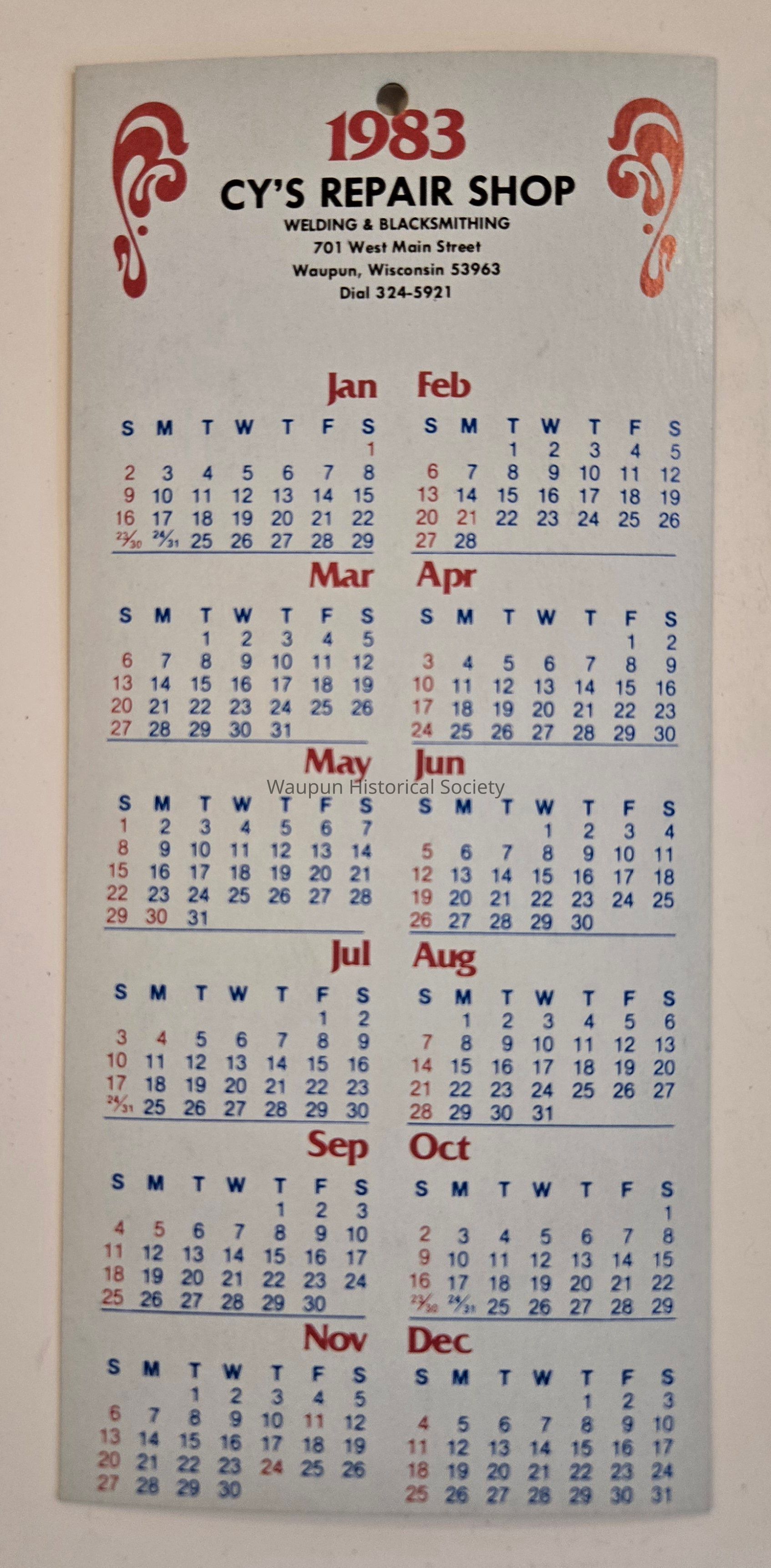 Calendar, Cy's Repair Shop, 1983