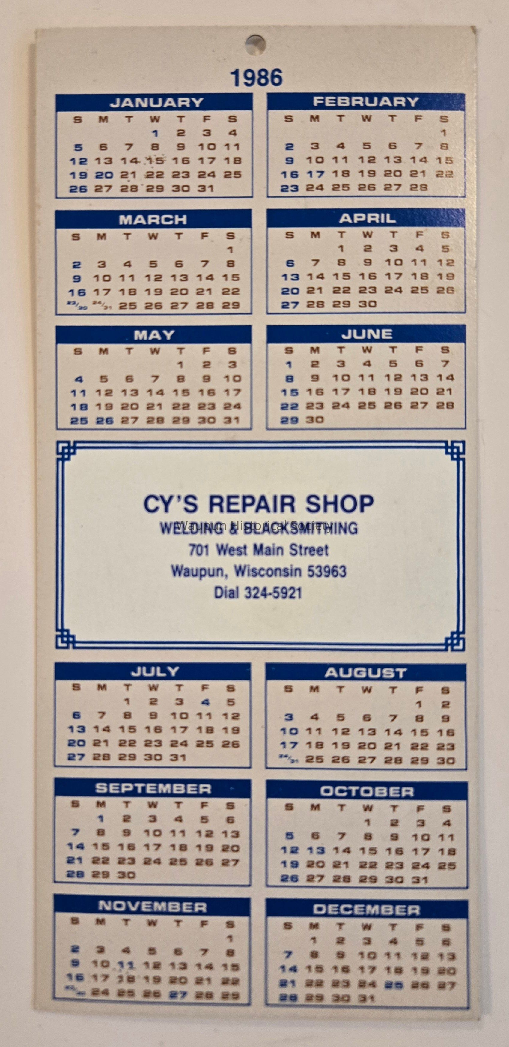 Calendar, Cy's Repair Shop, 1986