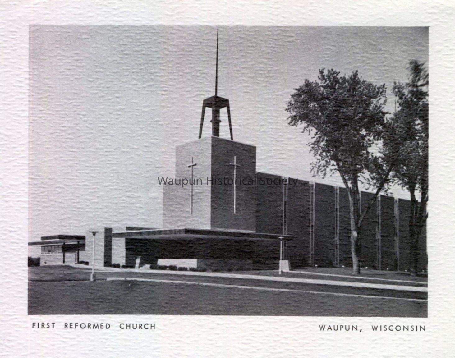Card, Church, First Reformed. Waupun Churches. This Thank You Card shows an early Church of Waupun, Wis. It was donated by Jim Laird from his personal collection. Inside the card is written: "The Library Committee wishes to thank you for the money gift for books. We hope many will be inspired by reading them. The Library Comm. of First Ref. Church,"Acquisition