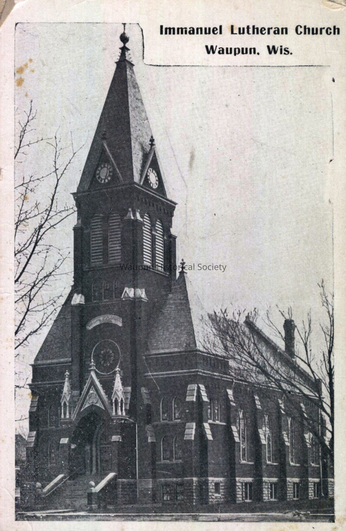 Card, Church, Immanuel Lutheran, Rev. William Staehling. Waupun Churches. This black & White picture postcard shows the Lutheran Church of Waupun, Wis. It was donated by Jim Laird from his personal collection. This is an unused postcard. On the reverse of this card it shows a picture of Rev. William Staehling, and handwritten it says: "525 W. Main St. services at 9 O' Clock a.m. in German, at 11 '" " " " " in English.Acquisition