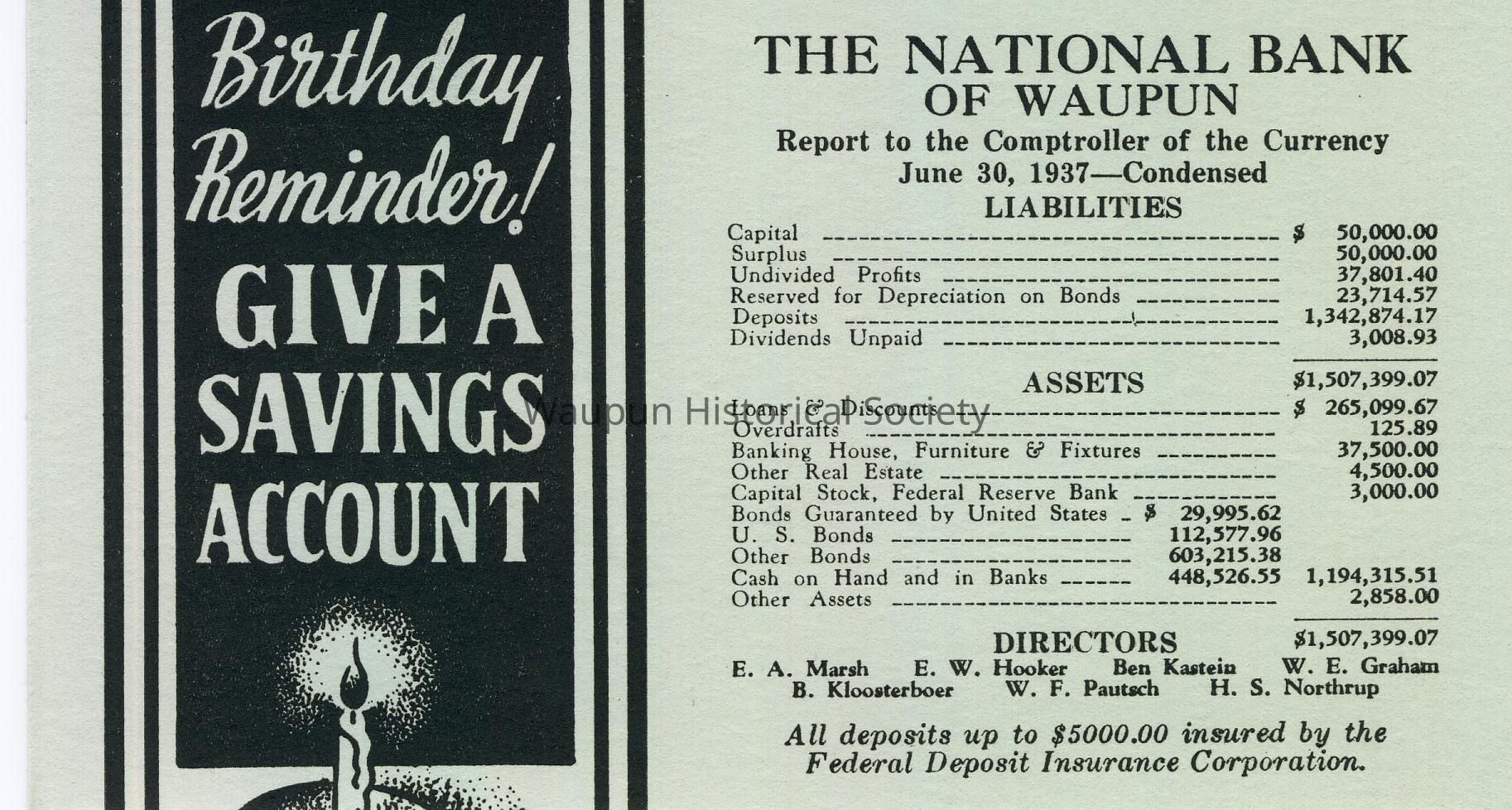 Birthday Reminder! Give a Savings Account (Ad for National Bank of Waupun)