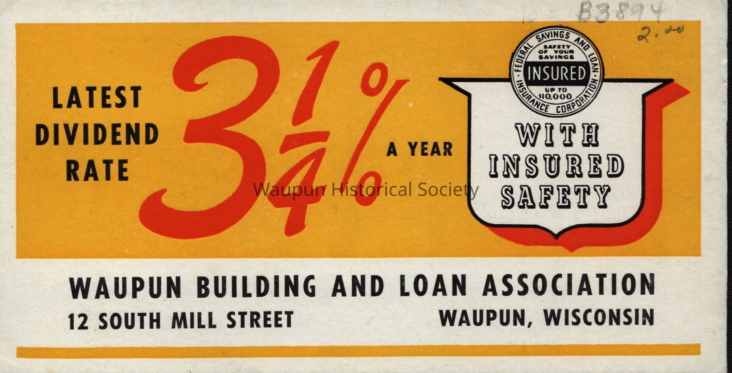 Card, Waupun Building and Loan Association, Latest Dividend Rate 3 1/4%Entry/Object ID