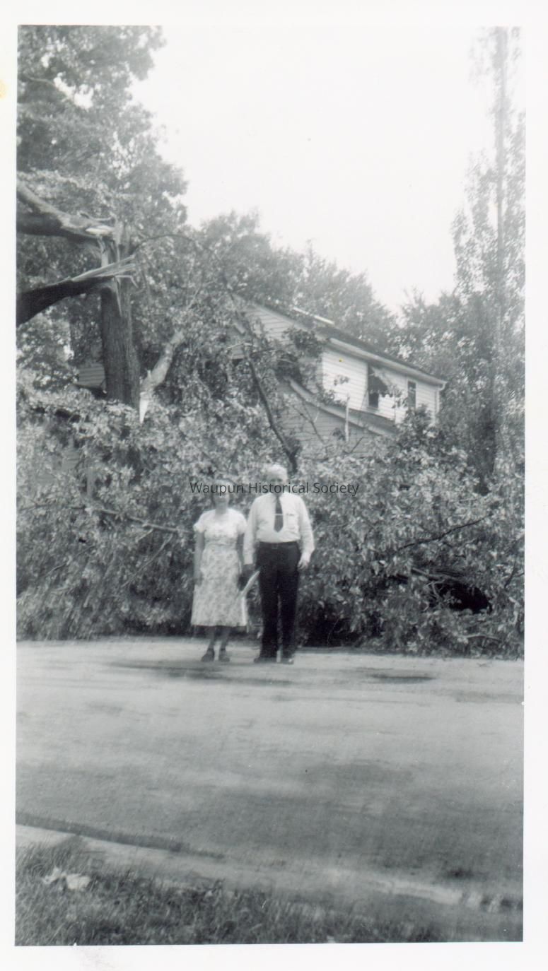 1953 Tornado. These photos were on loan from Gene and Betty Buchholz. They were returned to them after they were scanned. The only copies the Waupun Historical Society has are the electronic versions on disk. Caption on the back indicates "August 1, 1953 Lenora (Augustine) Buchholz with husband Helmuth Buchholz. Dodge Park Waupun WI. Helmuth is 54 years old. They are standing on the edge of Park St. Art Liebold's house in background."Acquisition