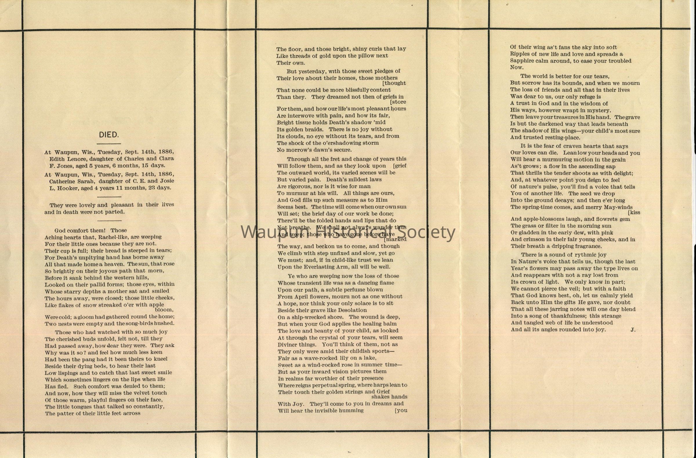 At Waupun, Wis., Tuesday, Sept. 14th, 1886, Edith Lenore, daughter of Charles and Clara F. Jones, aged 5 years, 6 months, 15 days.