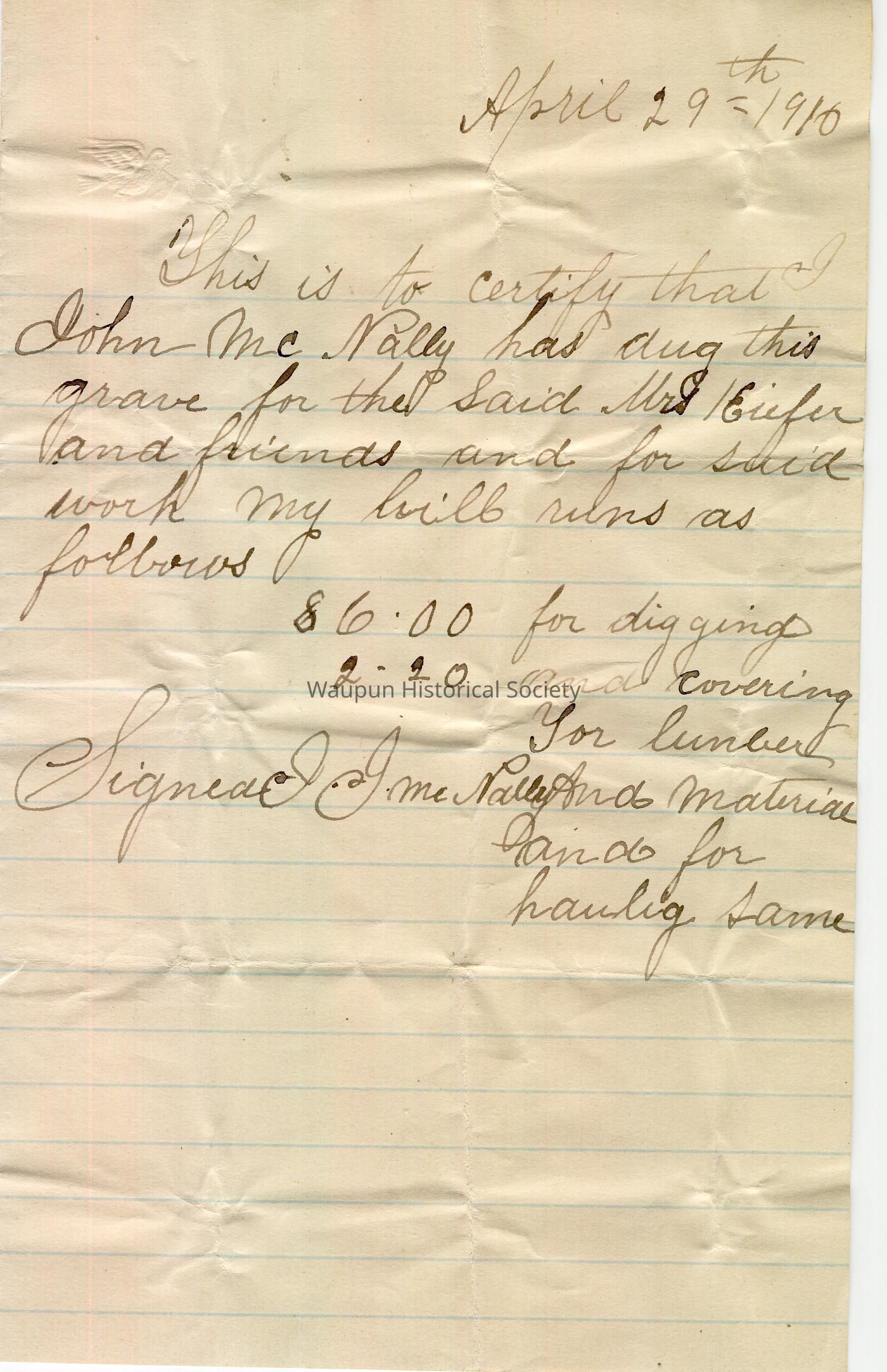 This is to certify that I John McNally has dug this grave for the said Mrs. Kiefer and friends and for said work my bill runs as follows: