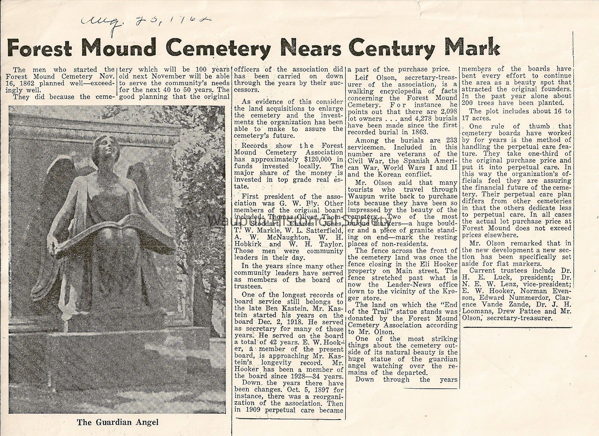 Newspaper Article, Recording Angel, Forest Mound Cemetery Nears Century Mark, August 23, 1962Entry/Object ID