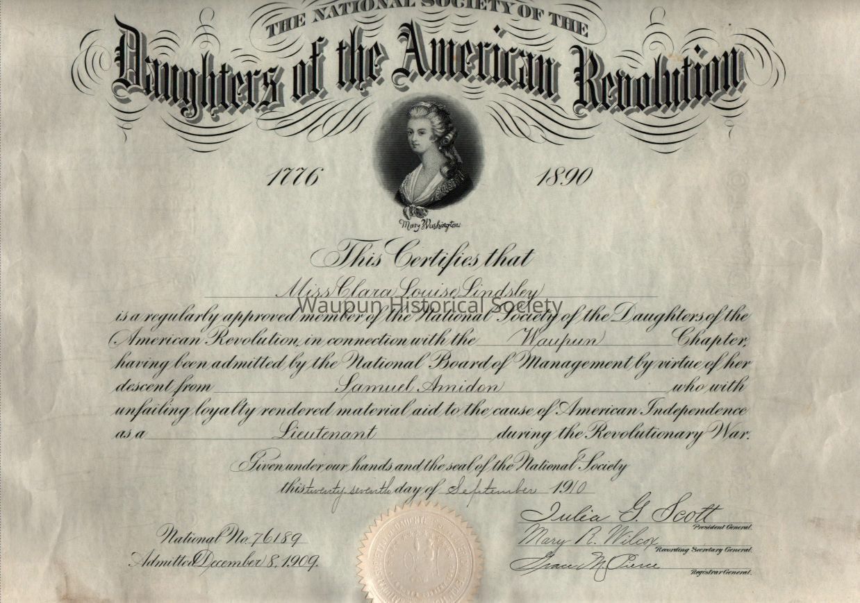 Certificate, Daughters of the American Revolution, Clara LindseyEntry/Object ID