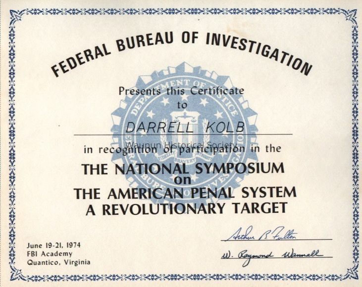 Certificate, FBI, The American Penal System, Darrell Kolb